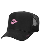 5 Panel Trucker hat with foam front and mesh back available in black. Embroidered with a cowboy hat in your choice of beige, pink or sky blue on the center front of the hat.