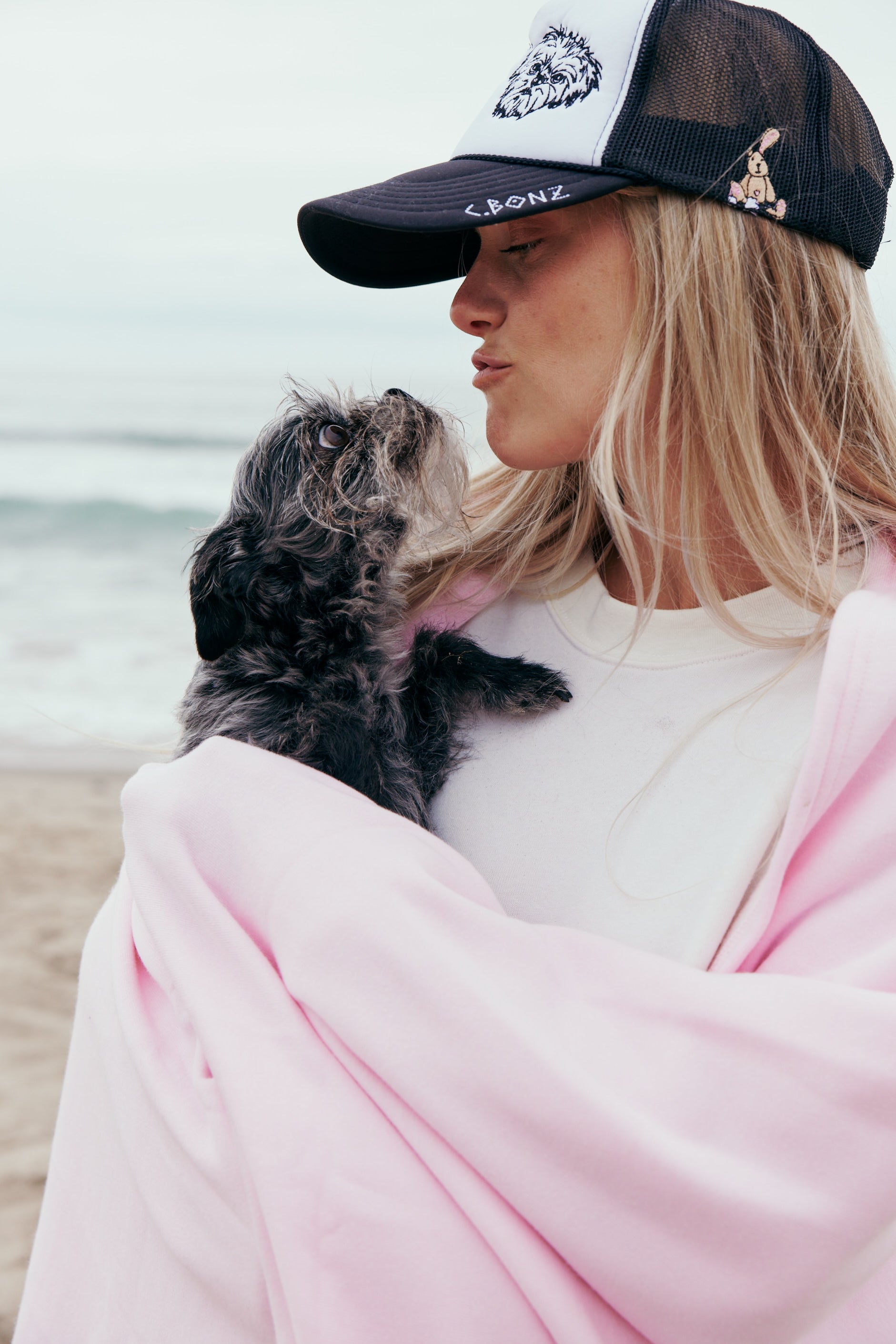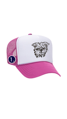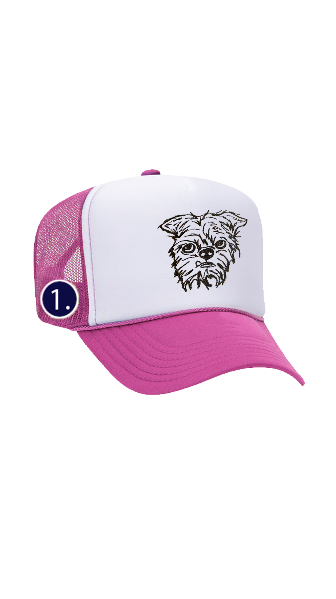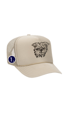 5 panel trucker hat with foam front and mesh back available in sand, black or pink with your pet's custom portrait embroidered on the center front of the hat and your choice of 1 mini designs embroidered the right temple. One size fits most.