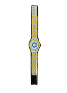 Embroidered bracelet "watch" set to Star of David time. Thread colors: Blue, metallic gold and metallic silver. Full embroidered front on recycled black cotton  and a velcro fastener. 8" x .75" x .2"