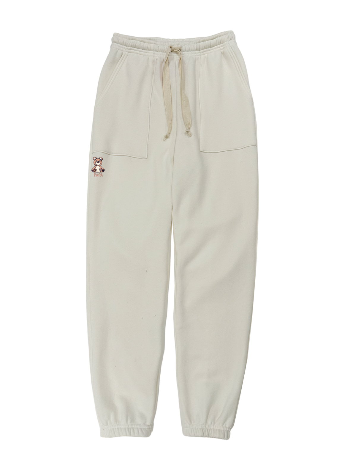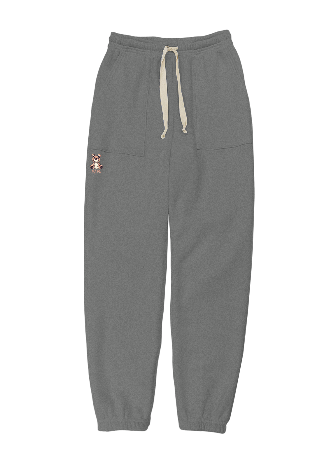 Men's sweatpants featuring a fold-over waistband with drawstring and flat front pockets made from my special Ridiculously Cozy fabric in your choice of cream, charcoal, oat, or Zuma blue. Featuring my Papa Bear design below the right pocket.