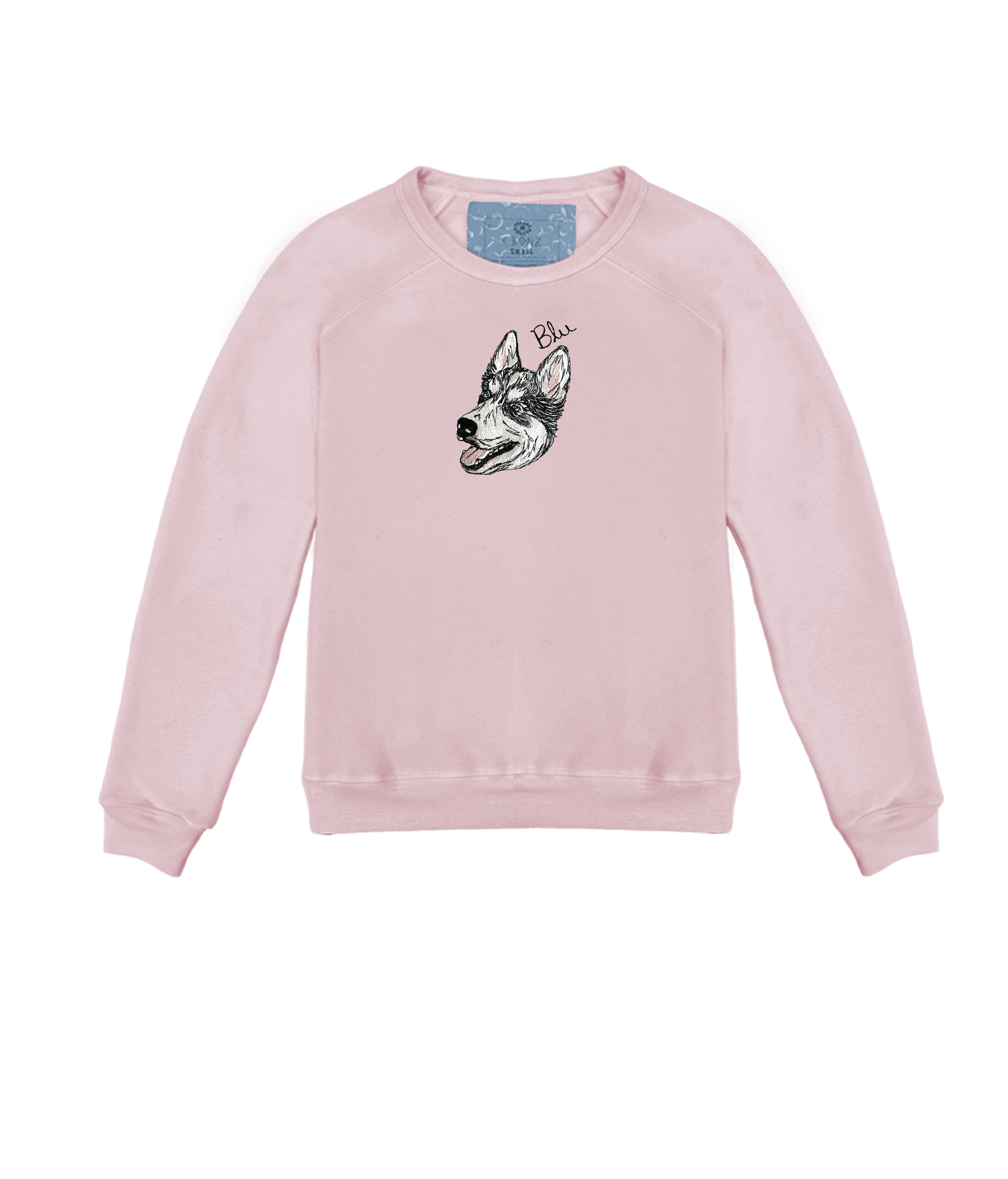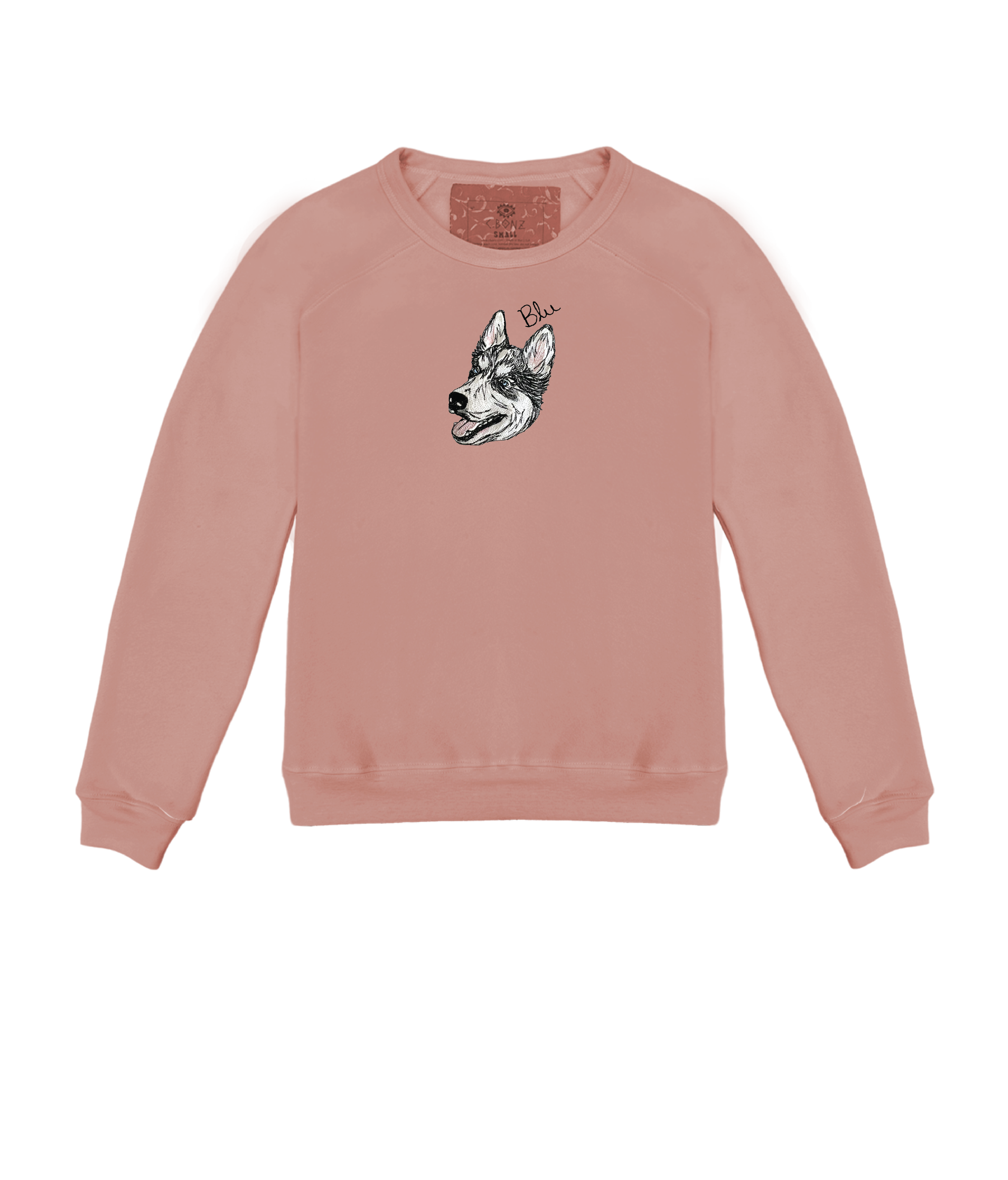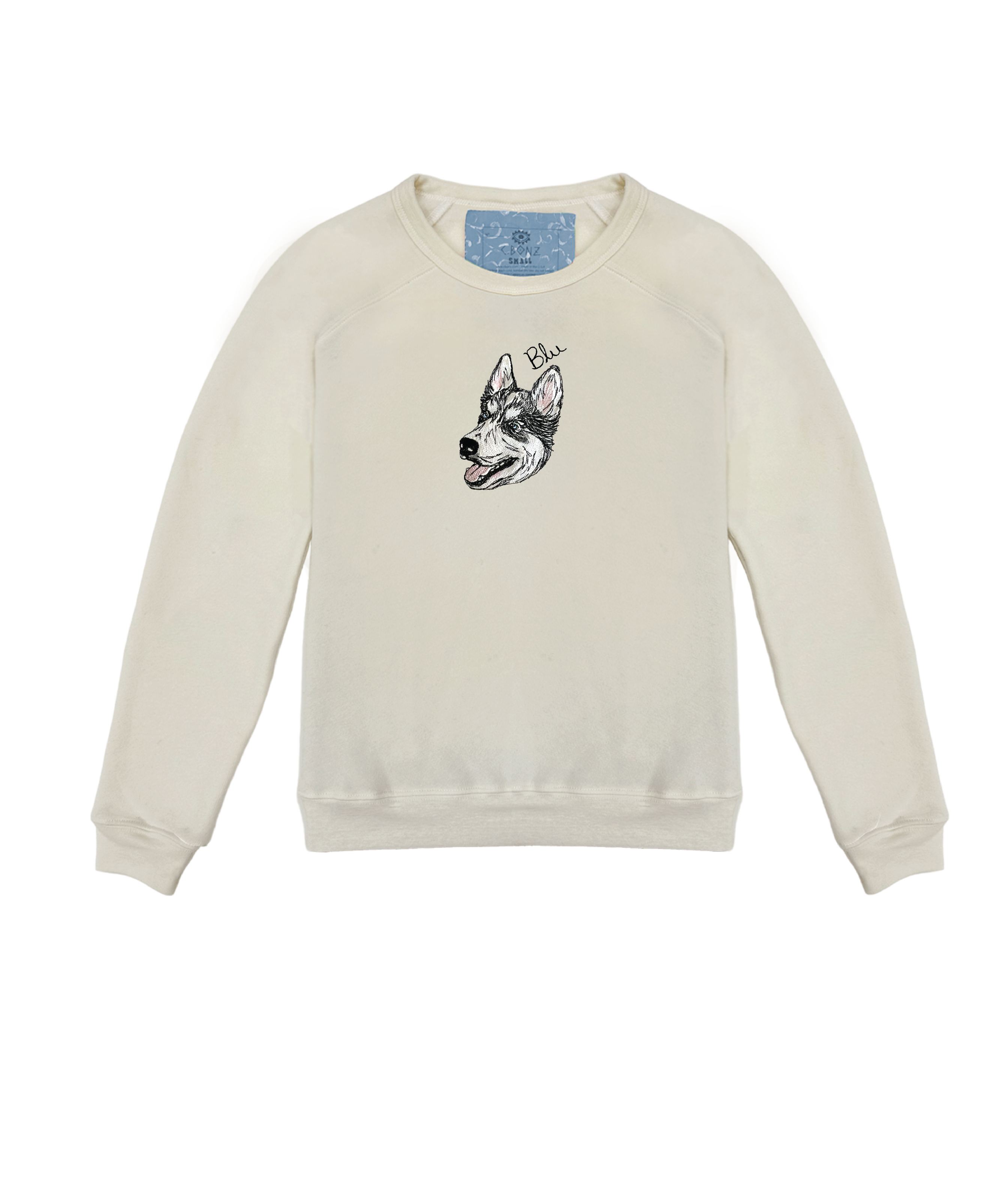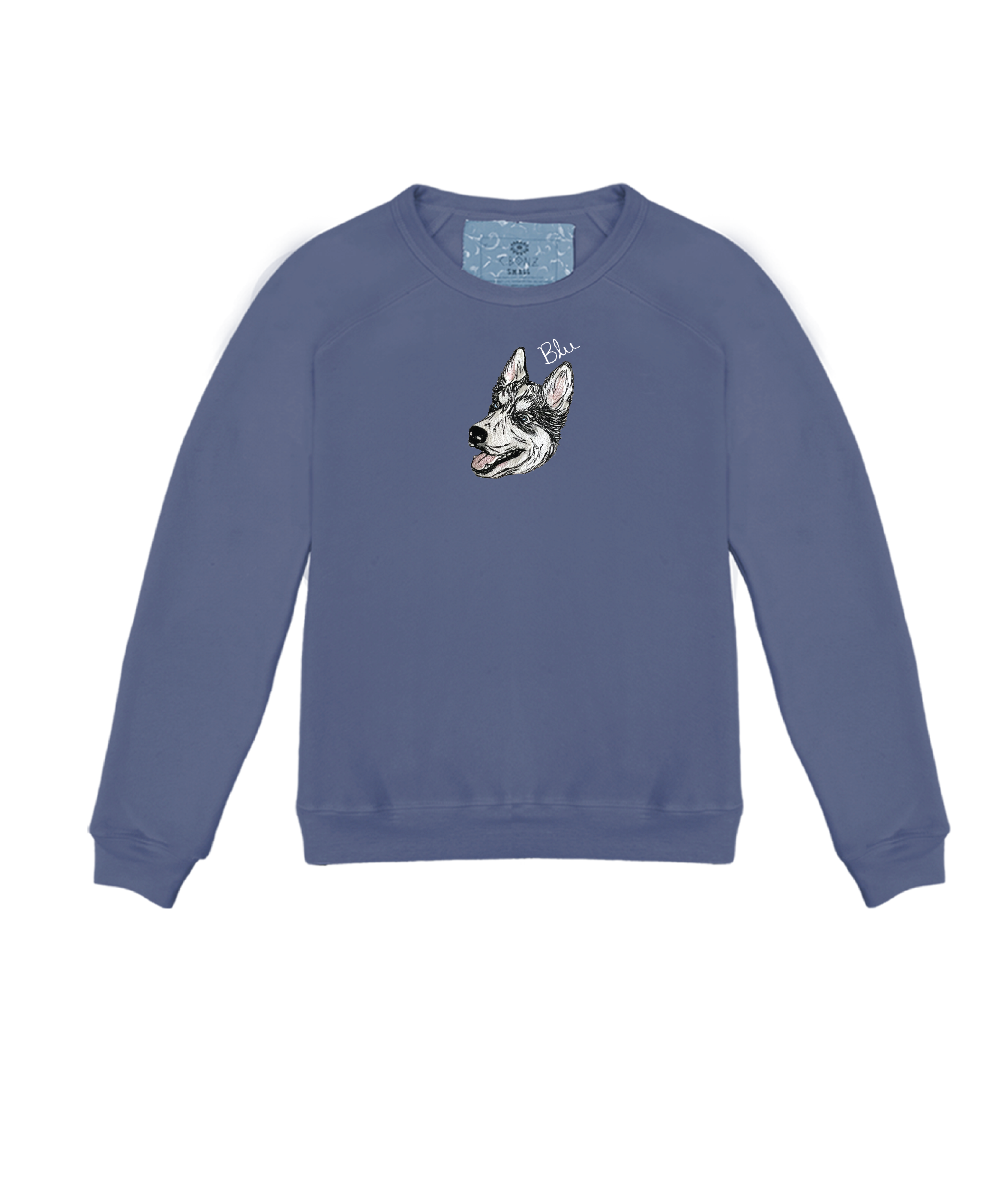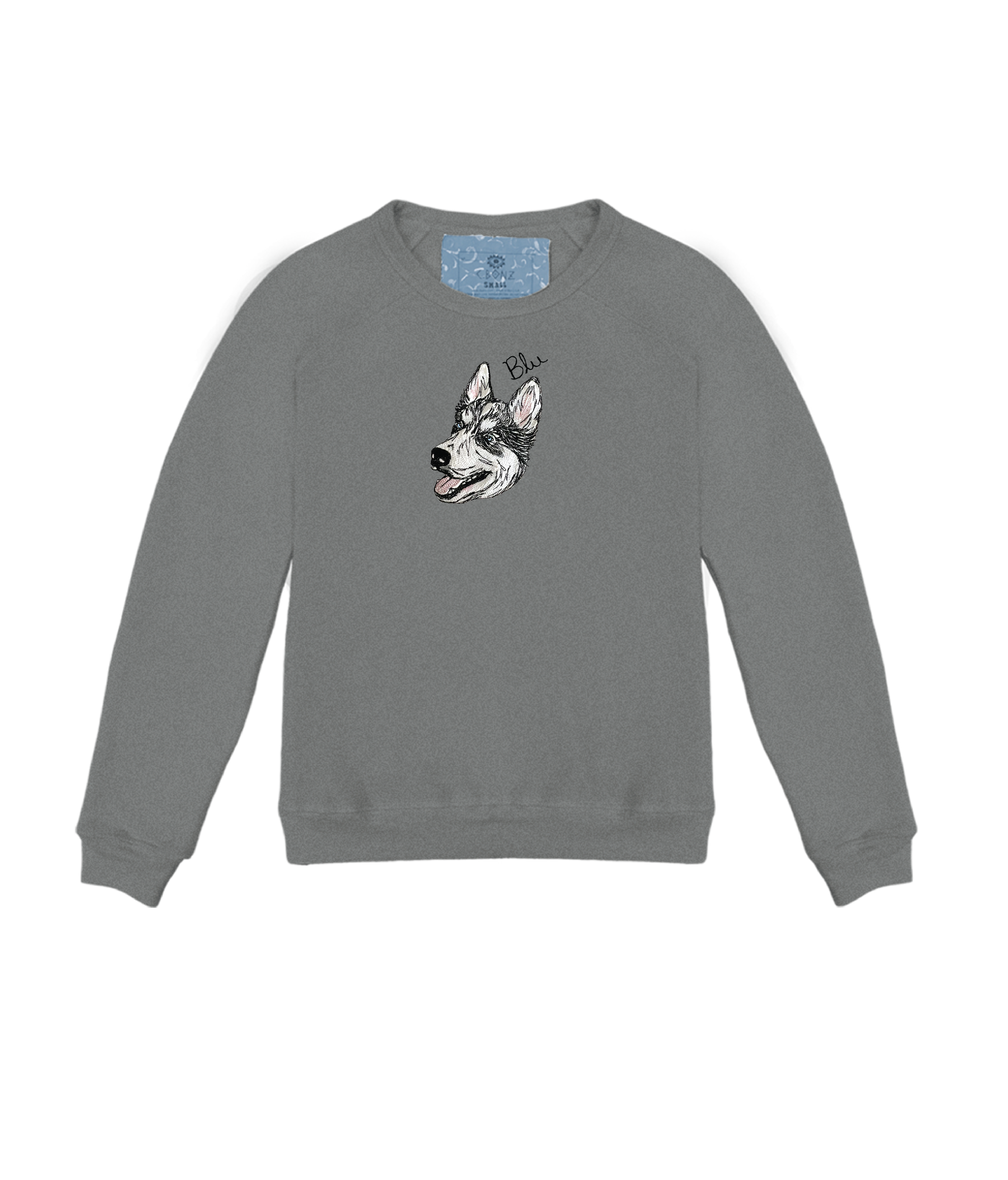 Kids' cut crewneck pullover made from my special Ridiculously Cozy fabric in your choice of charcoal, cream, sunset pink, zuma blue, or terra cotta featuring a Custom Pet Portrait of your pet (or pets) in my exclusive Doodle illustration style with their name(s) embroidered on the center chest. Upload your pet's photo and input their name below.