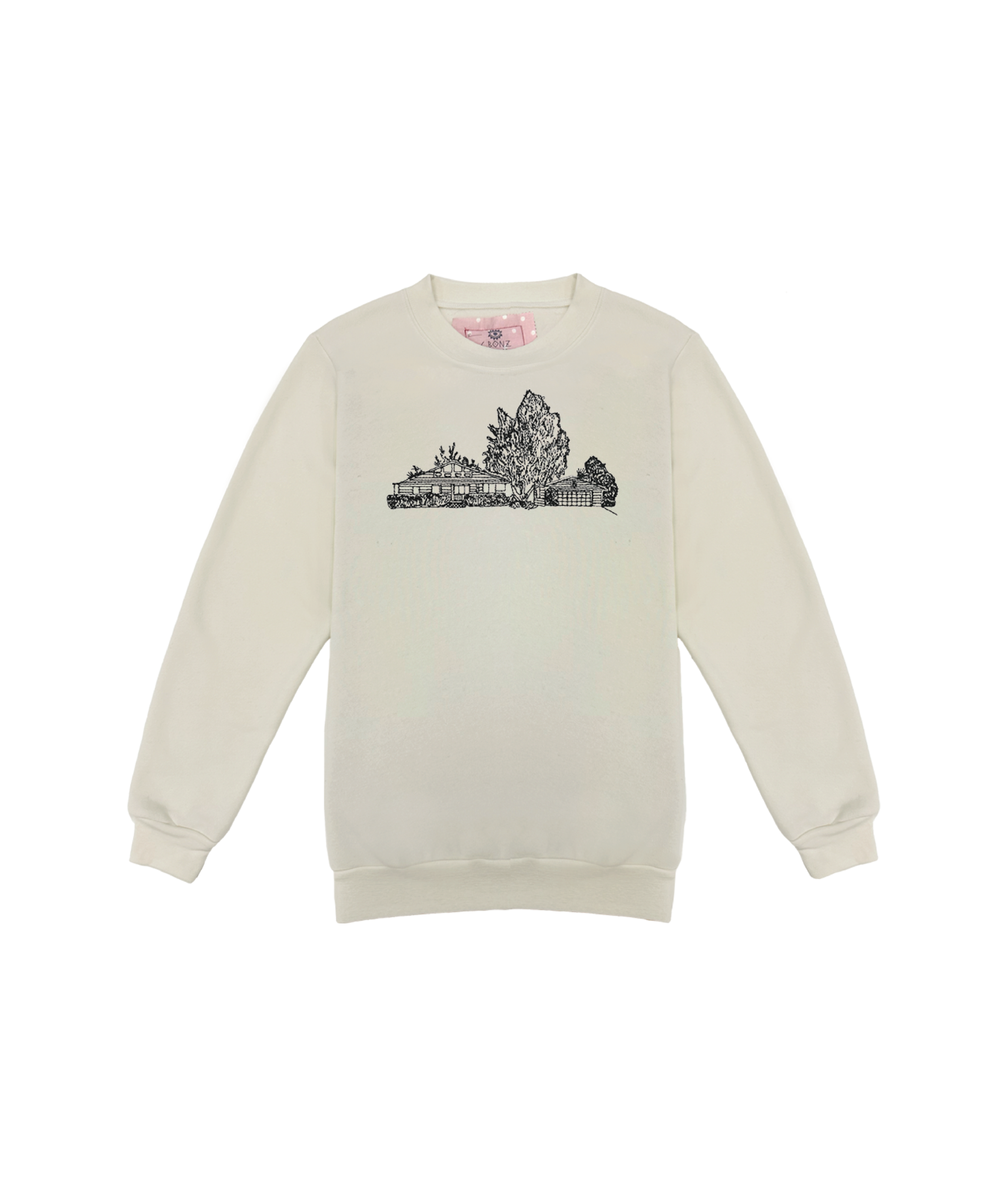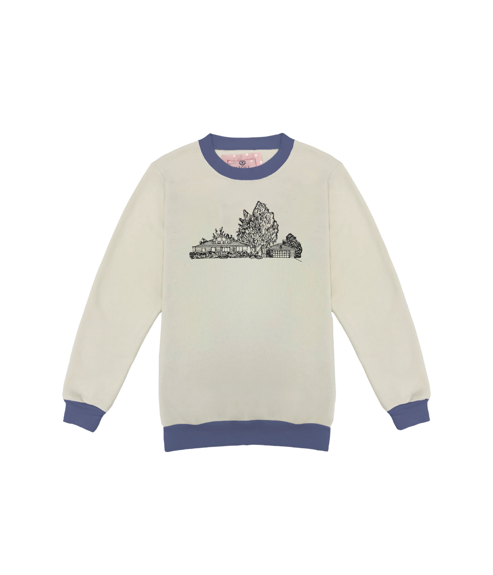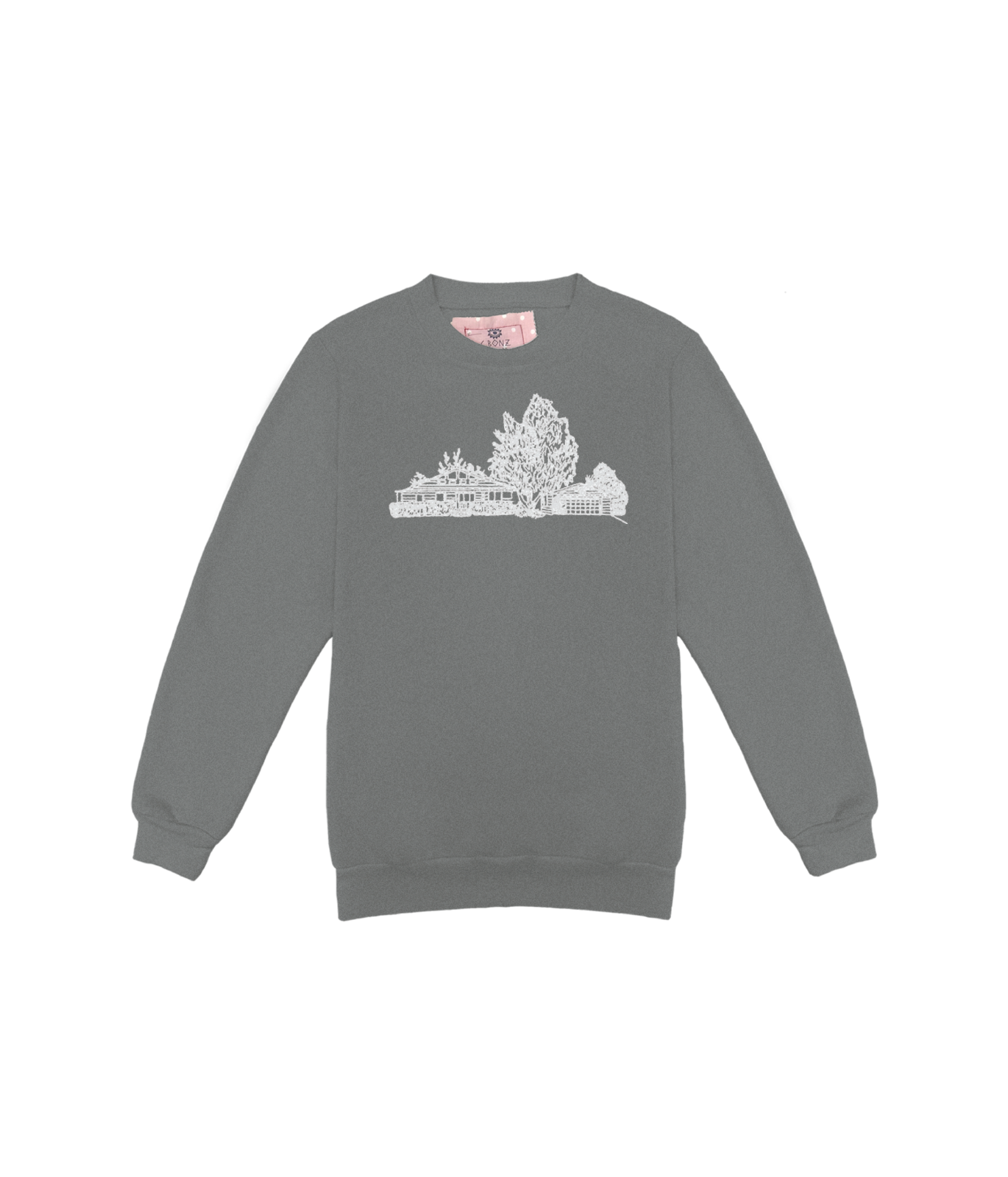 Men's pullover in charcoal featuring a custom hand drawn embroidery design of your home (or other meaningful building) with your house number (or other phrase) on the left lower shoulder seam.