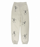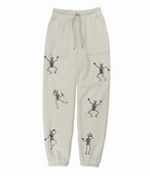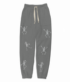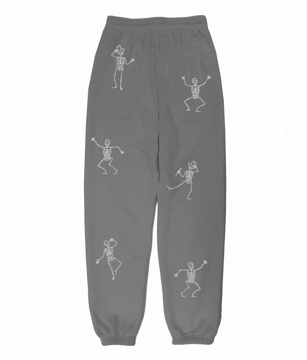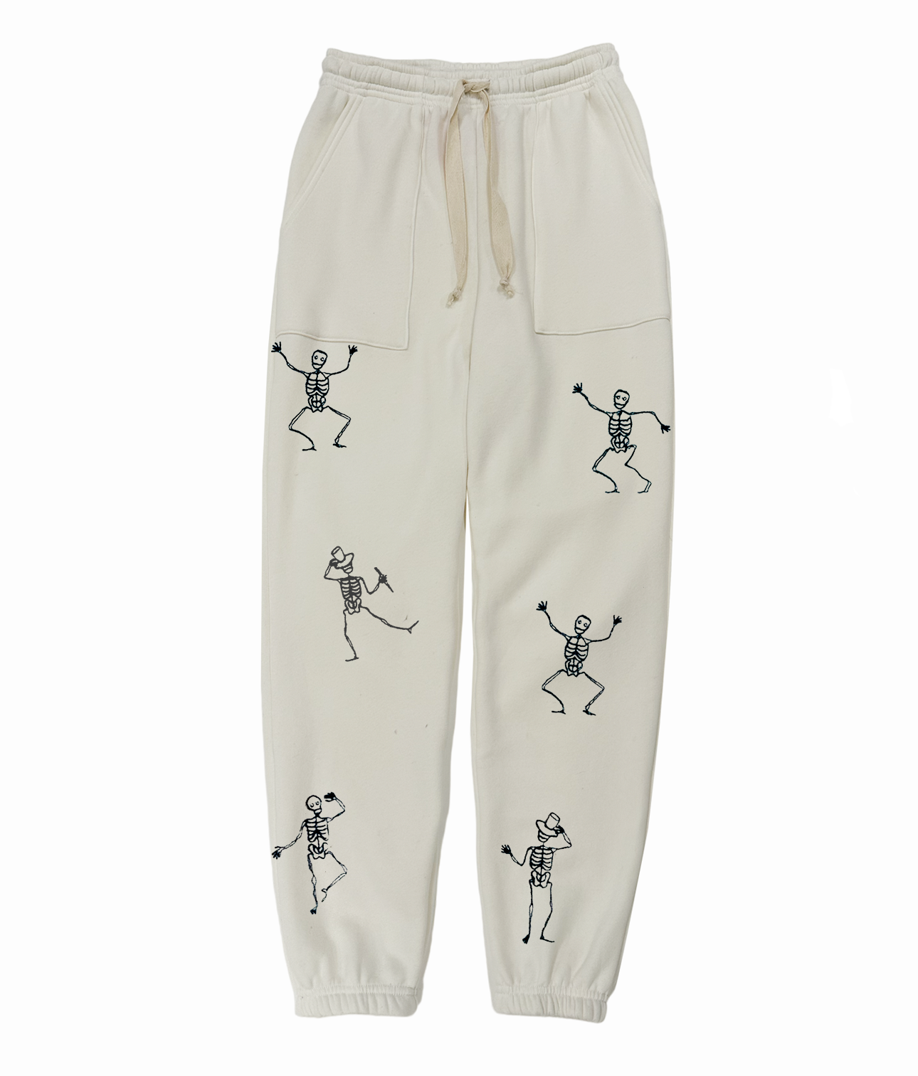 Men's sweatpants featuring a fold-over waistband with drawstring and flat front pockets. Made from my special Ridiculously Cozy fabric in your choice of cream or charcoal. Featuring my exclusive Dancing Skeletons embroidery sprinkled all over.