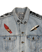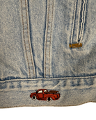 This light wash vintage Levi’s jacket is a true collector’s piece, with intricate embroidery that captures a laid-back surf culture vibe. The front features two surfboards and embroidered safety pins above the chest pockets, two flowers on the collar, and a red car on the bottom left corner. The back steals the show with 9 surfers carrying surfboards, framed by an intricate black floral pattern for added texture and depth.