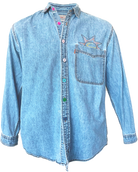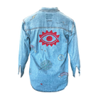Levis denim button down. C.bonz embroidered sun scribble on the breast, heart on the collar, scribbles all over the back, heart on the back, stars on the back, C.Bonz logo on the back center, and C.Bonz eye on the back.