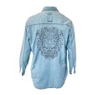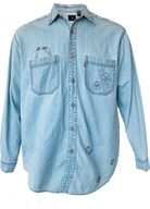 Faded denim Levi’s button down. C.bonz embroidered crab claws above right breast pocket, sand dollars on left breast pocket, and sugar scull on the back.