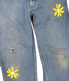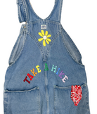 Step into retro vibes with these one-of-a-kind light wash denim vintage overalls! Featuring cheerful yellow daisies on the front and a playful “Take a Hike” message in colorful lettering on the back, they’re made for anyone who loves standout, carefree style. A bandana tucked into the pocket adds an extra pop of personality.