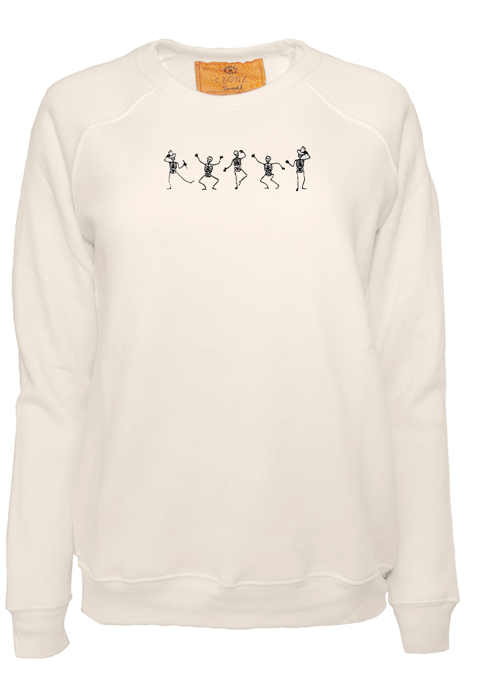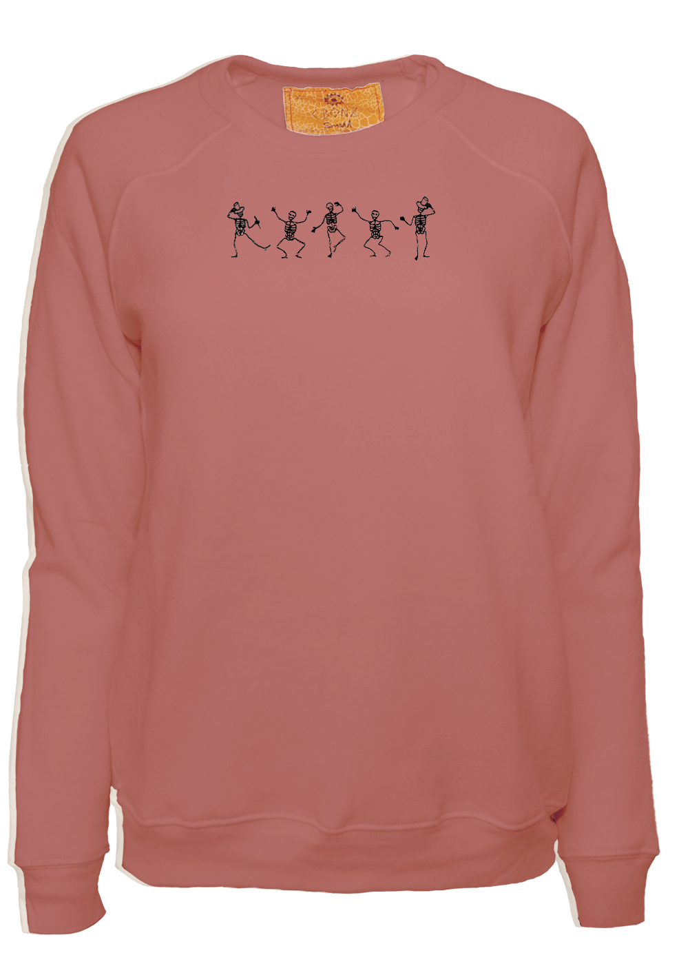 My classic cut crewneck pullover in womens' sizing. Made from my special Ridiculously Cozy fabric in your choice of cream or terracotta embroidered with my exclusive Dancing Skeleton embroidery design on the center chest. Made in Malibu, California.