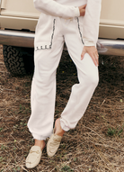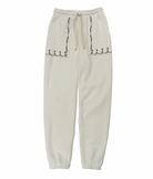 Women's oversized sweatpants featuring fold-over waistband with drawstring and flat front pockets. Made from my special Ridiculously Cozy fabric cream. Featuring my exclusive Skeleton Pocket design embroidered around the pockets.