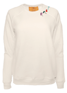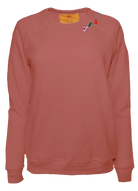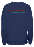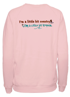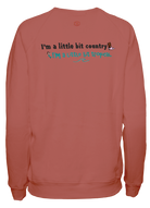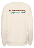 My classic cut crewneck pullover made from my special Ridiculously Cozy fabric in your choice of cream, sunset pink, terracotta, or zuma blue featuring four mini embroideries on the neckline and embroidered text on the back: "I'm a Little Bit Country | I'm a Little Bit Tropical."