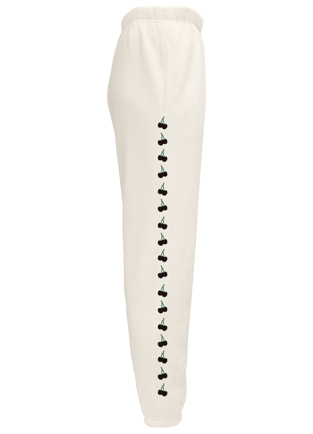My classic sweatpants with front side-slip pockets made from my special Ridiculously Cozy fabric in your choice of cream or pink tie dye featuring black cherries along the right leg. Tie dye is hand-done and $25 extra.