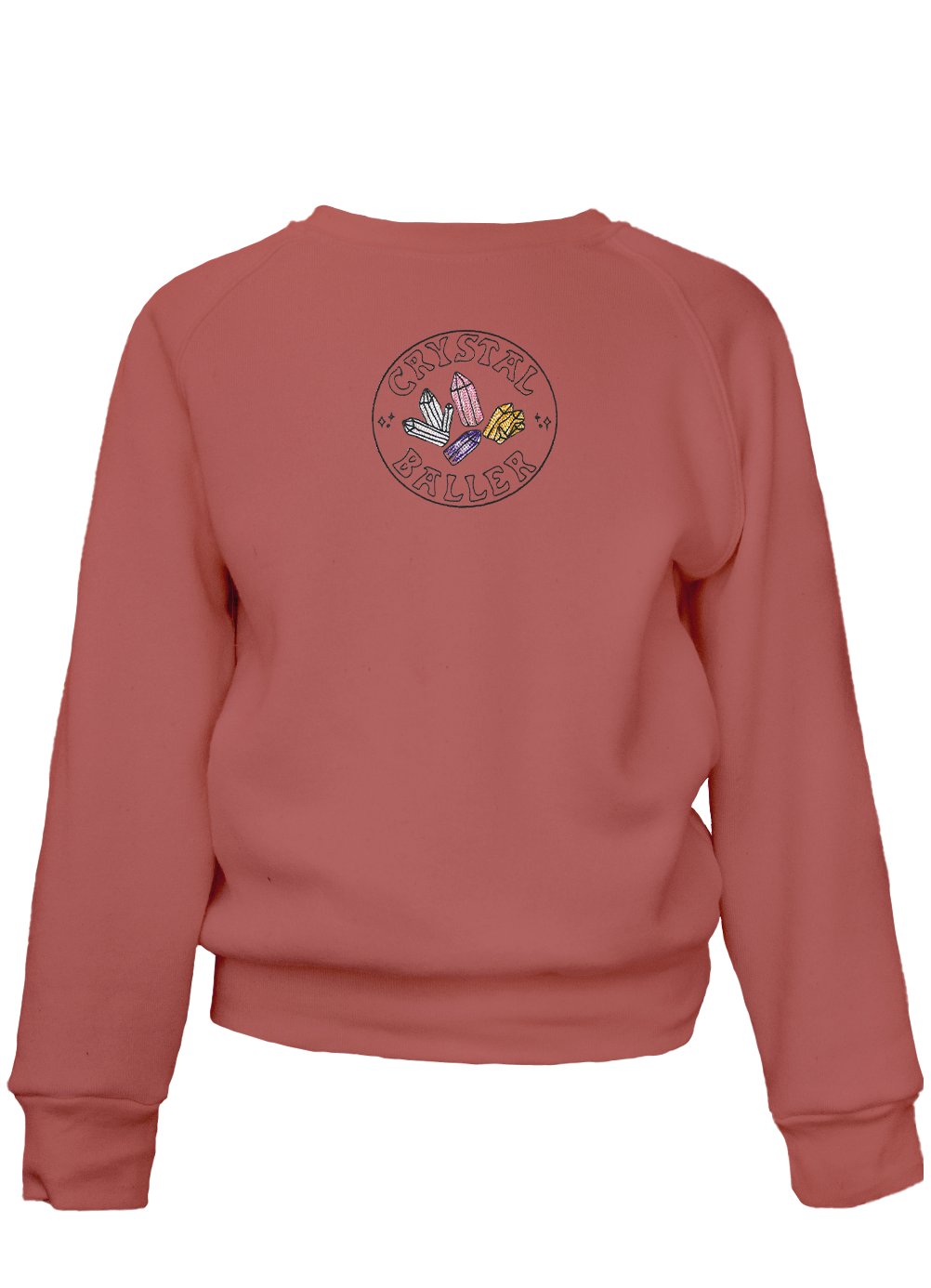 My classic cut crewneck pullover in kids' sizing. Made from my special Ridiculously Cozy fabric in your choice of natural, sunset pink, zuma blue, or terracotta embroidered with my exclusive Crystal Baller design embroidered on the center chest. Made in Malibu, California.