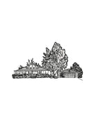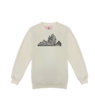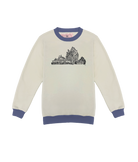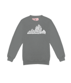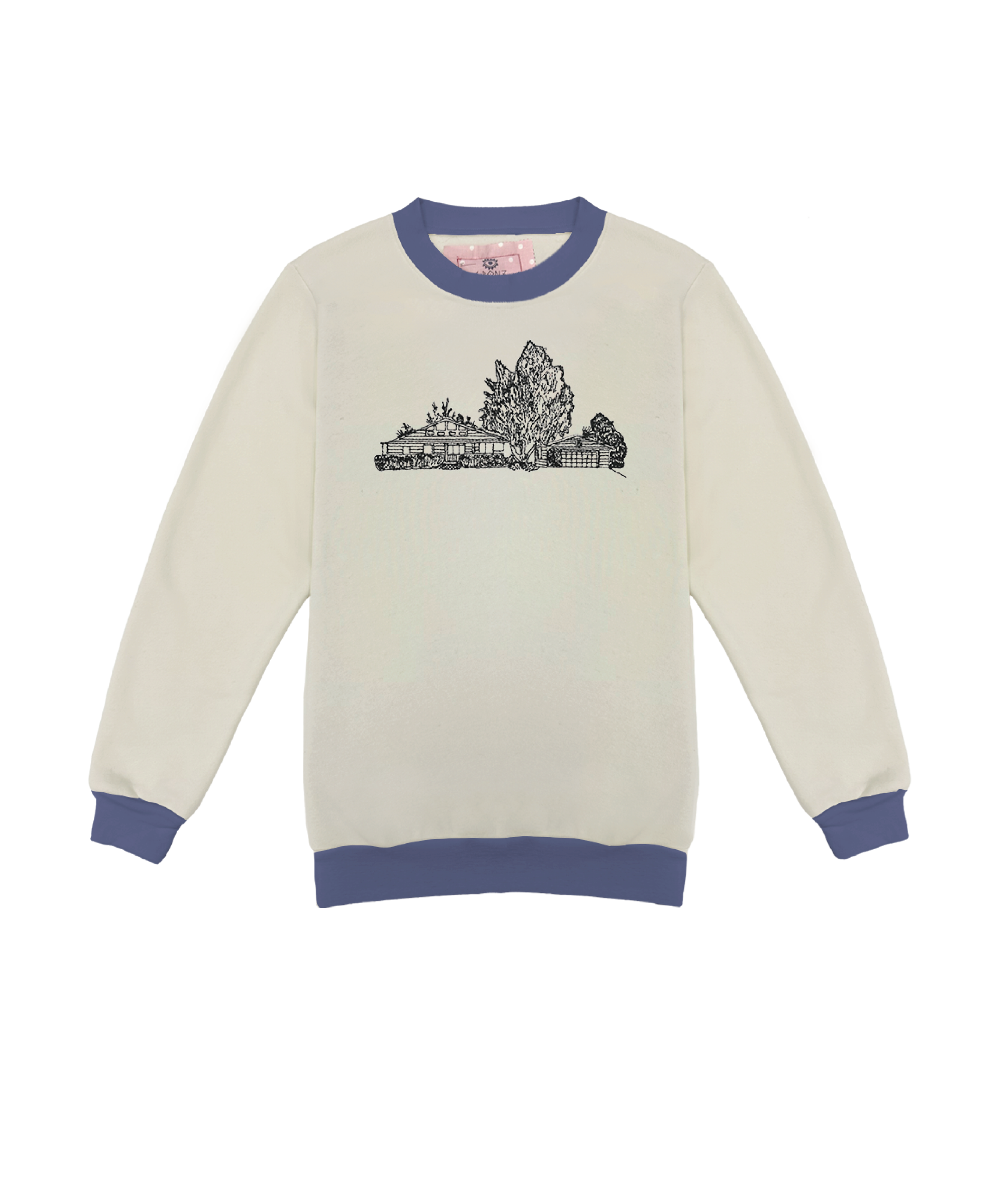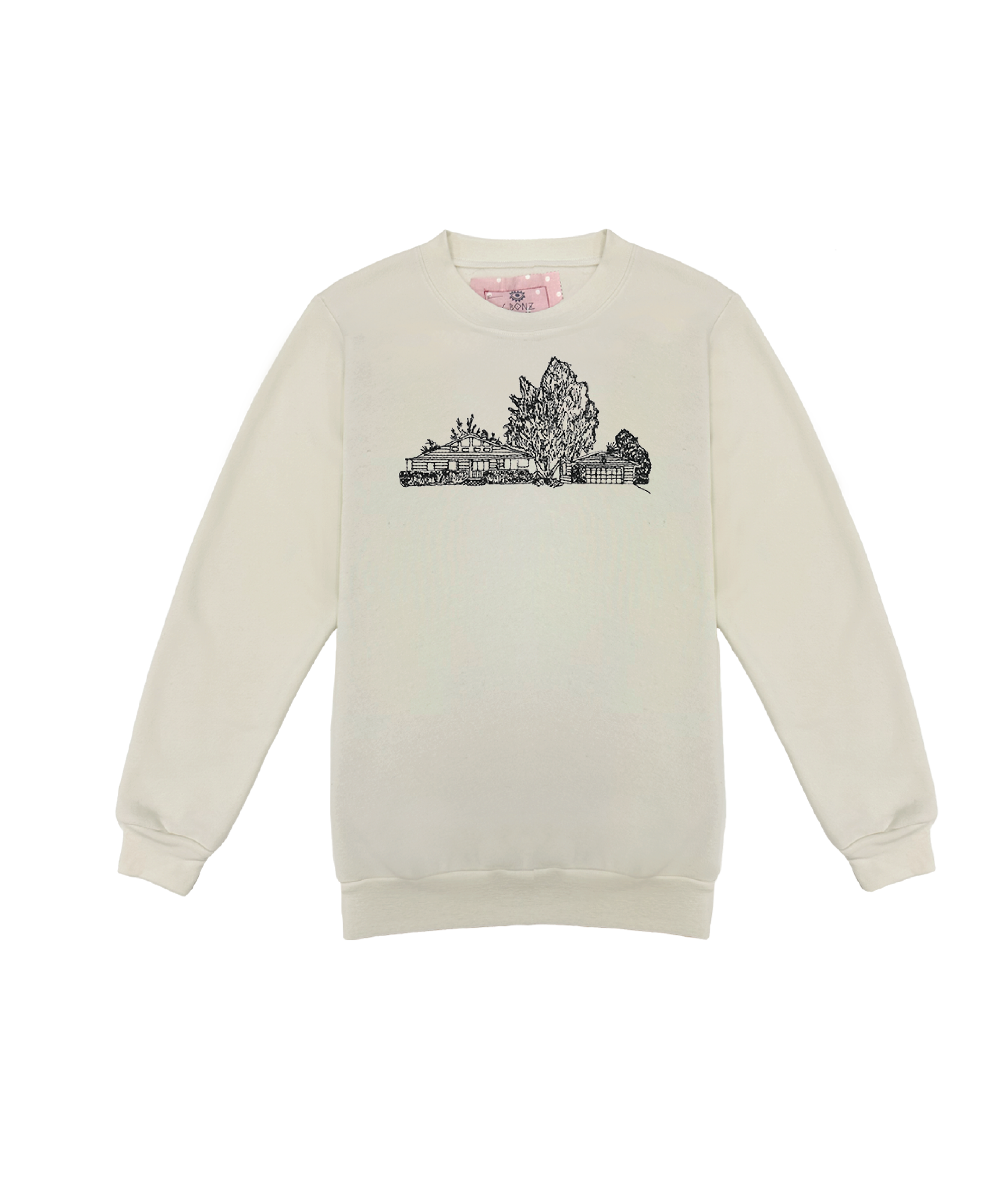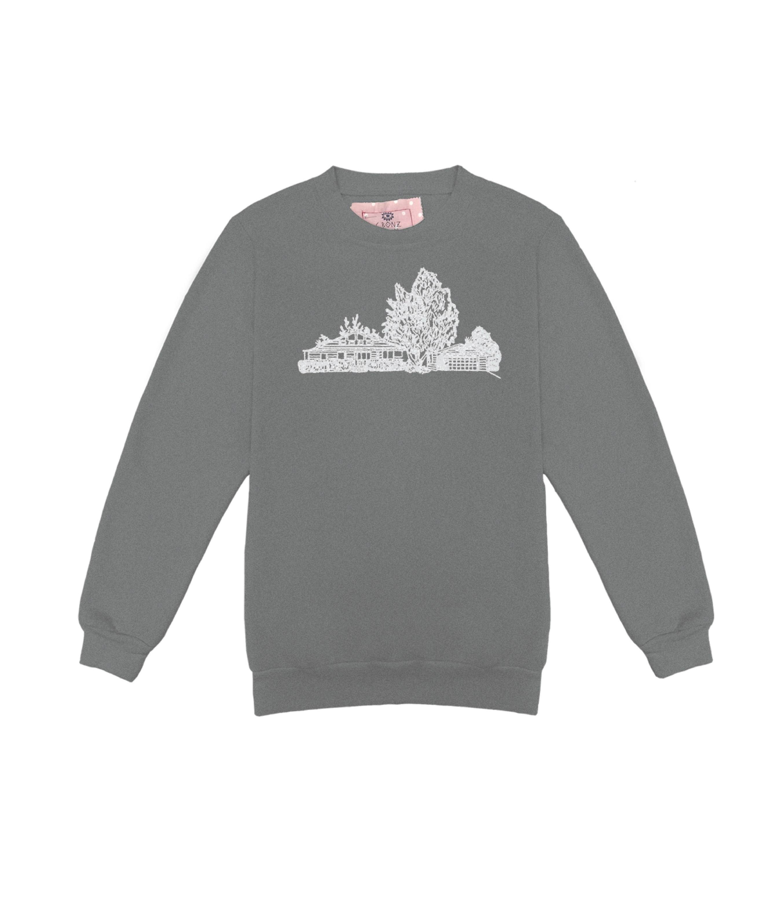 Men's pullover in charcoal featuring a custom hand drawn embroidery design of your home (or other meaningful building) with your house number (or other phrase) on the left lower shoulder seam.