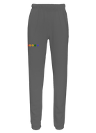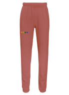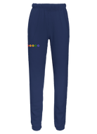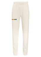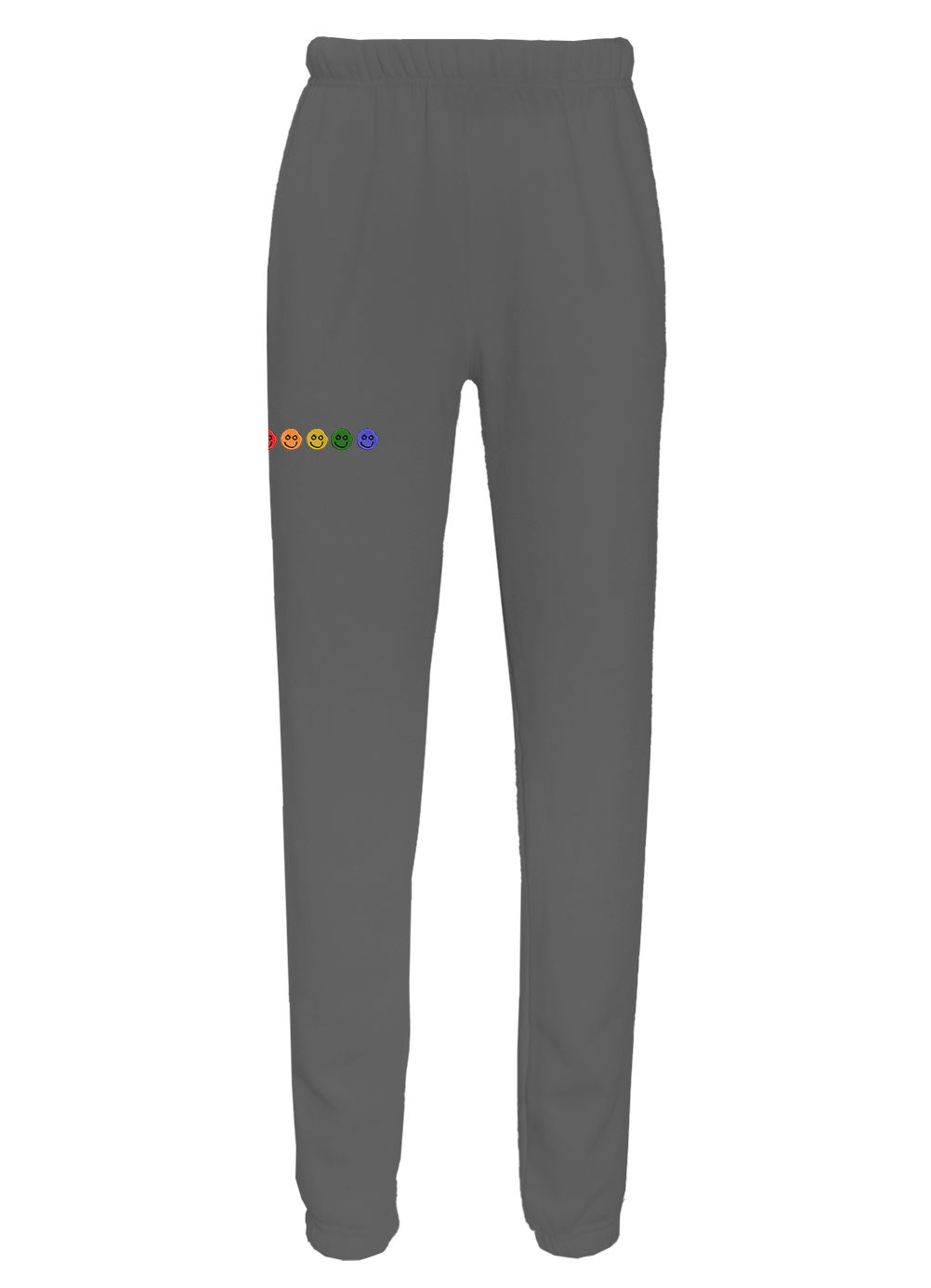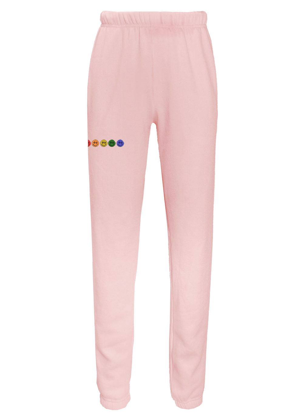 My classic sweatpants with front side-slip pockets made from my special Ridiculously Cozy fabric in your choice of cream, sunset pink, terracotta, charcoal, or Zuma blue featuring 5 happy faces in a rainbow gradient embroidered on the right thigh.