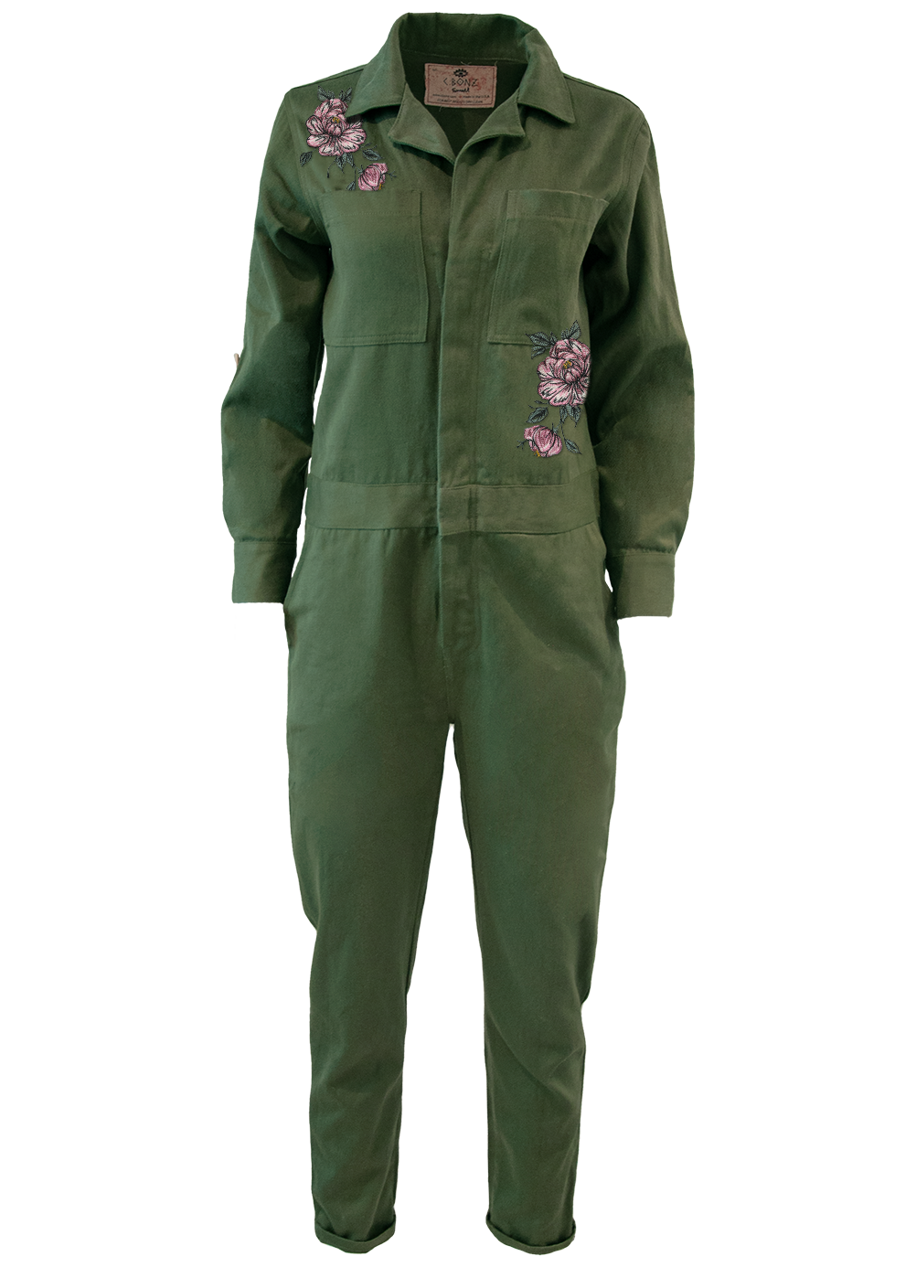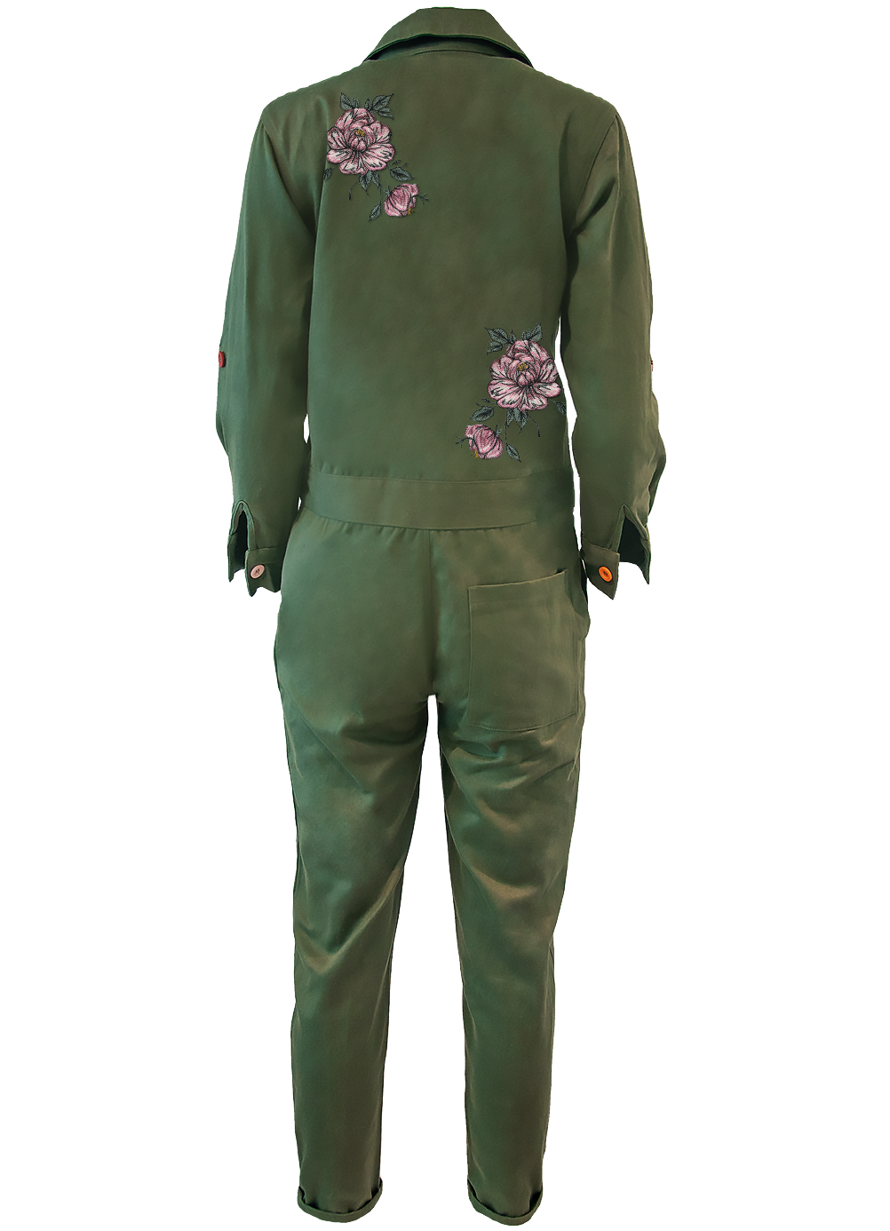 A sturdy yet soft jumpsuit with with a randomized rainbow button closure. Made in Los Angeles, California from organic hemp and cotton. Embellished with peonies on the front and back.