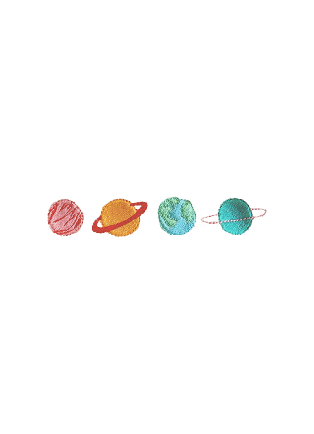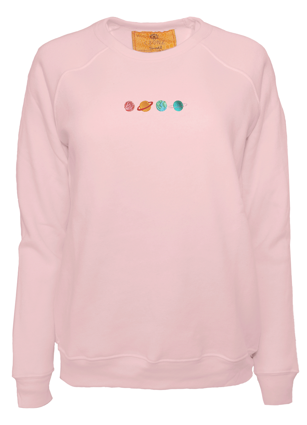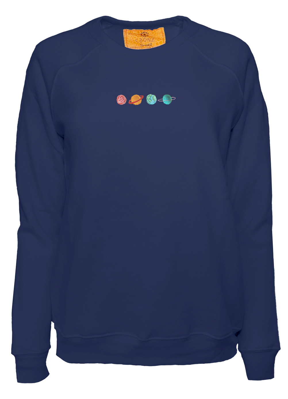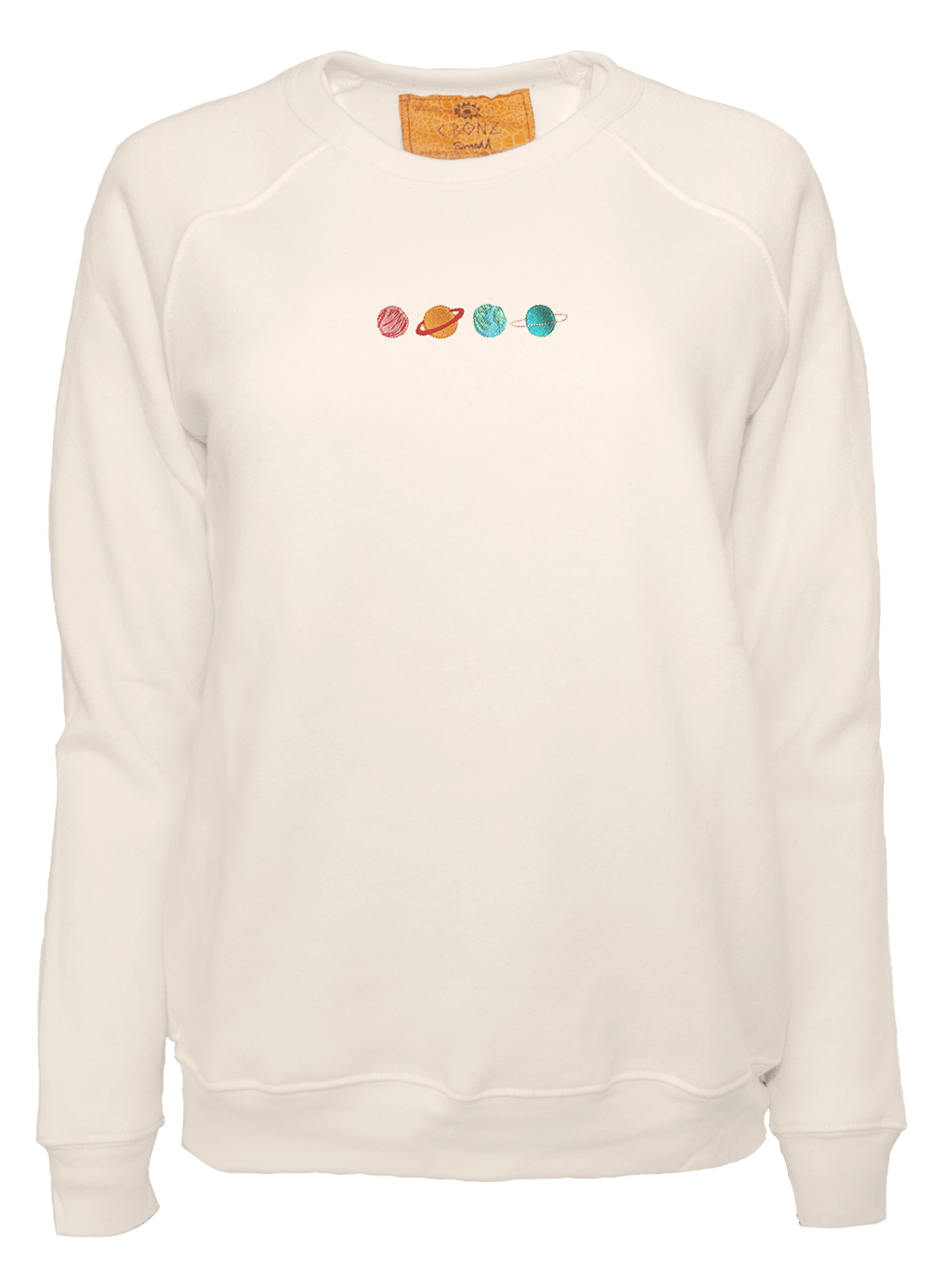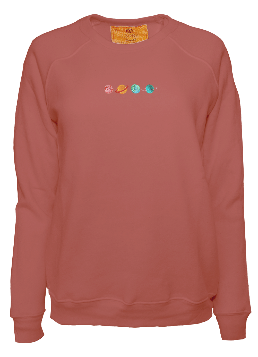 There's a whole universe in you! My classic cut crewneck pullover made from my special Ridiculously Cozy fabric in cream, sunset pink, terracotta, or navy featuring four planets embroidered art across the center chest.