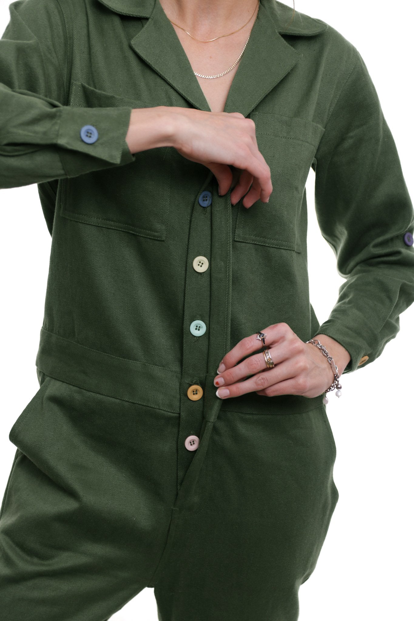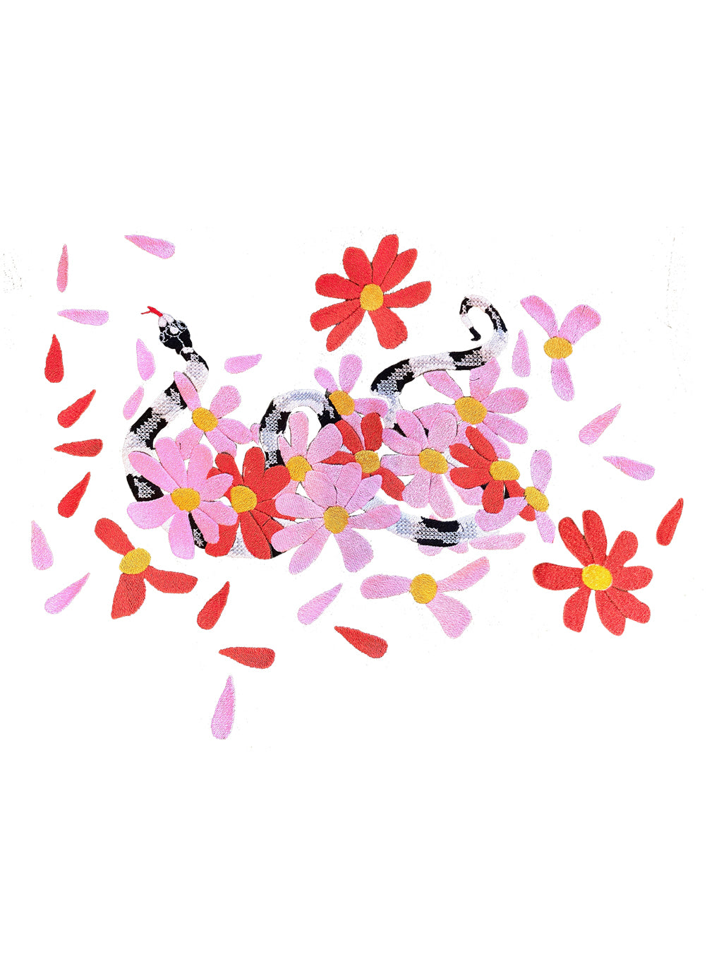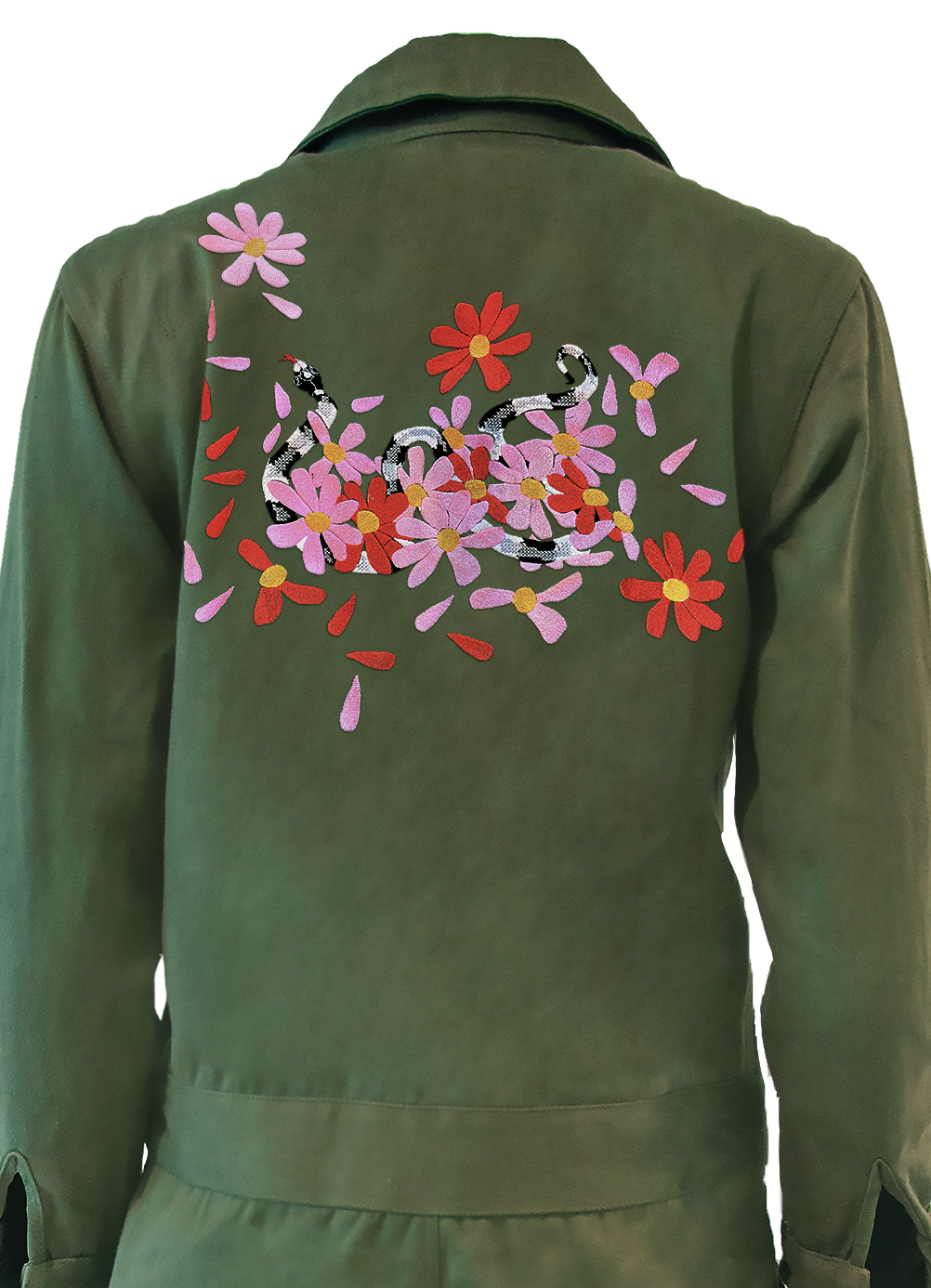 A sturdy yet soft jumpsuit with with a randomized rainbow button closure. Made in Los Angeles, California from organic hemp and cotton. Featuring my original art of a snake bathing in a cluster of flowers that spill over the left shoulder to the front.