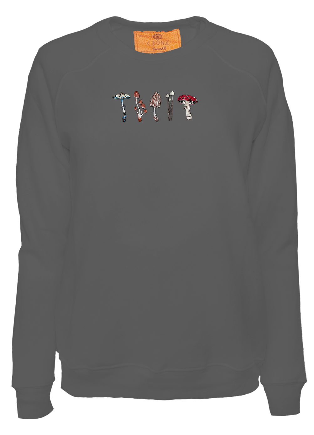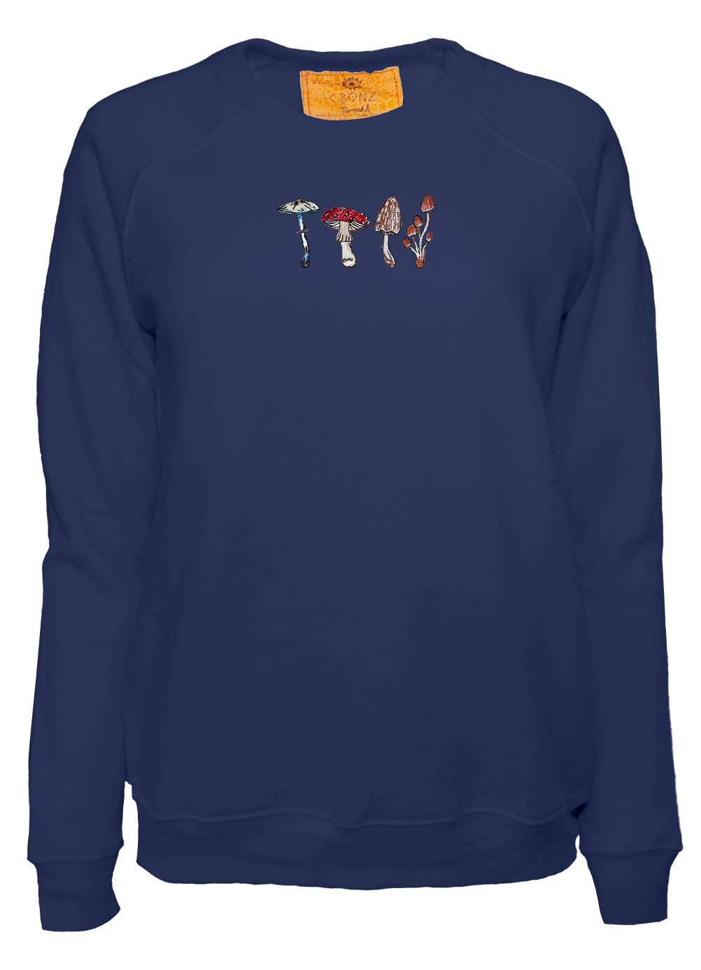 My classic cut crewneck pullover made from my special Ridiculously Cozy fabric in your choice of cream, sunset pink, terracotta, and zuma blue featuring four mushrooms on the center chest and neckline.