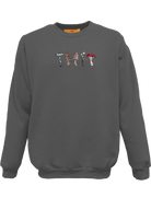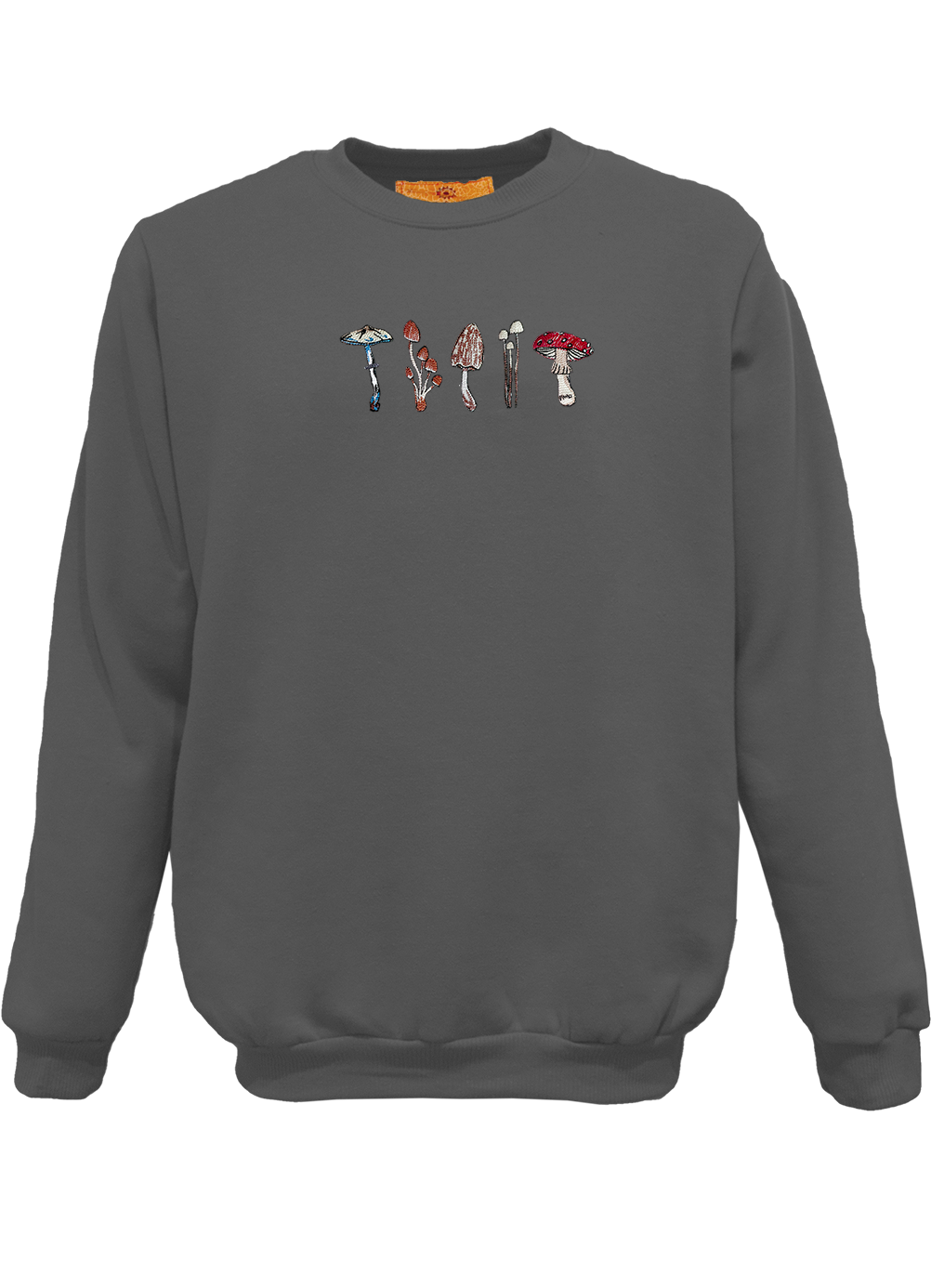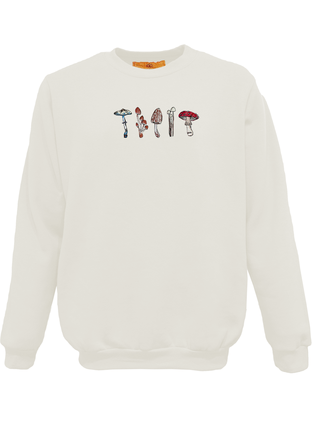 Men's pullover made from my special Ridiculously Cozy fabric in your choice of charcoal or cream featuring four mushrooms on the center chest and neckline.