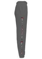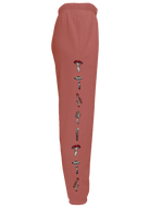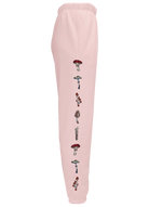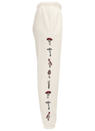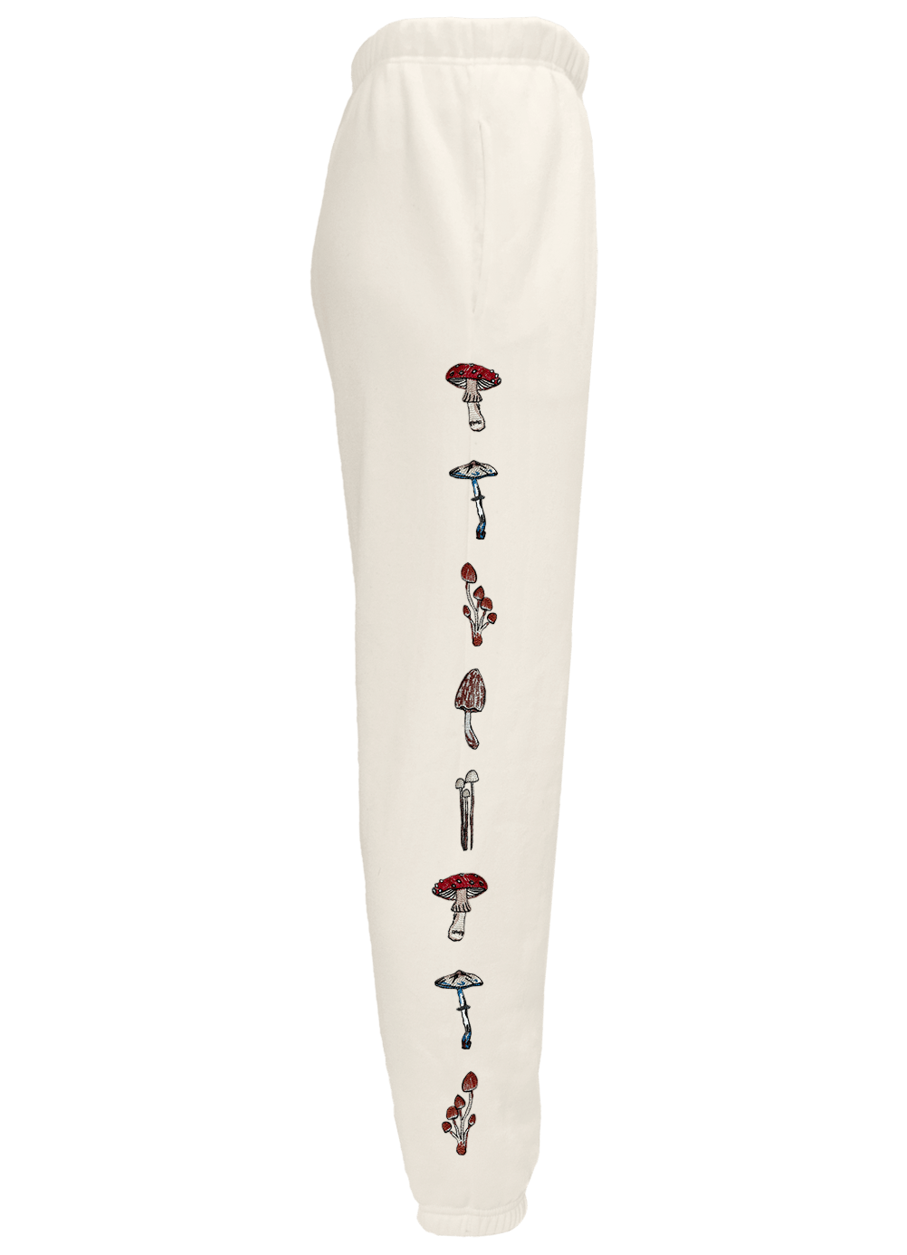 My classic sweatpants with front side-slip pockets made from my special Ridiculously Cozy fabric in your choice of cream, sunset pink, terracotta, charcoal, or zuma blue featuring various mushroom illustrations along the right leg.