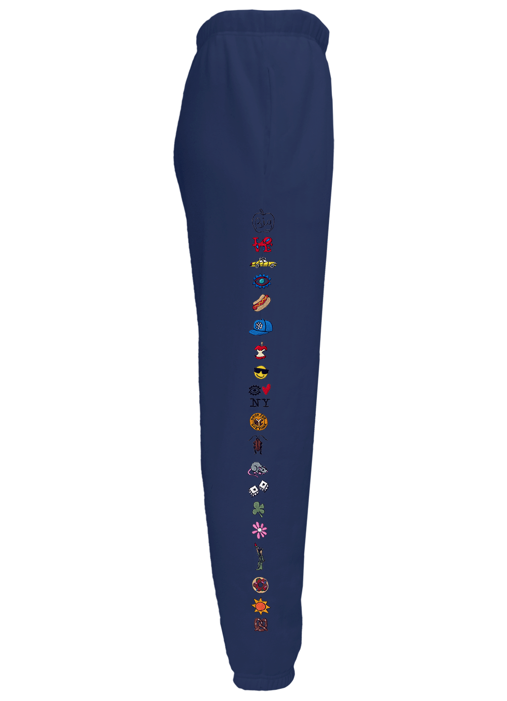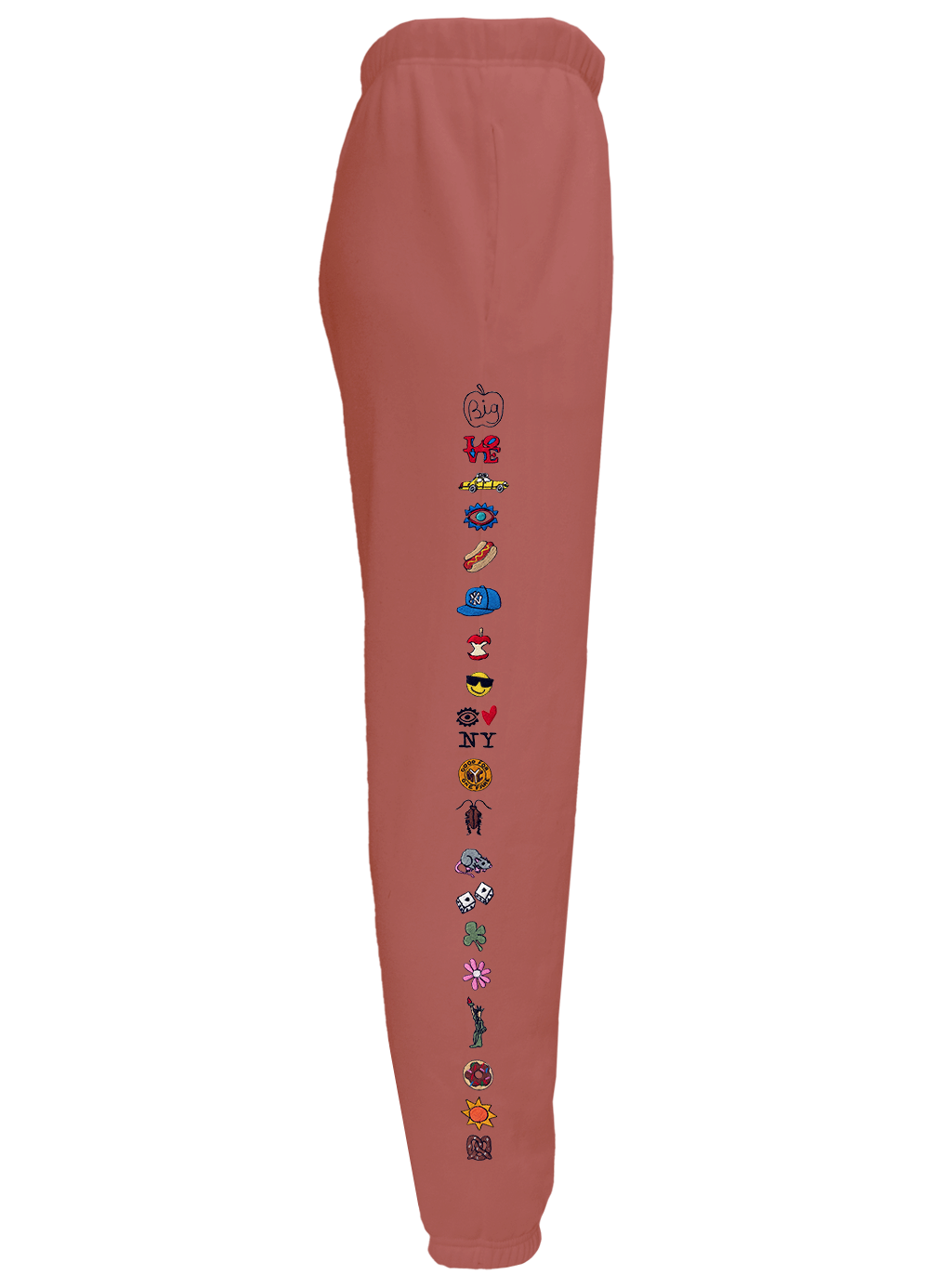 My classic sweatpants with front side-slip pockets made from my special Ridiculously Cozy fabric in cream, sunset pink, terracotta, charcoal, or Zuma blue with embroidery along the side of the right leg. The embroidery is an homage to the beautiful city of New York.