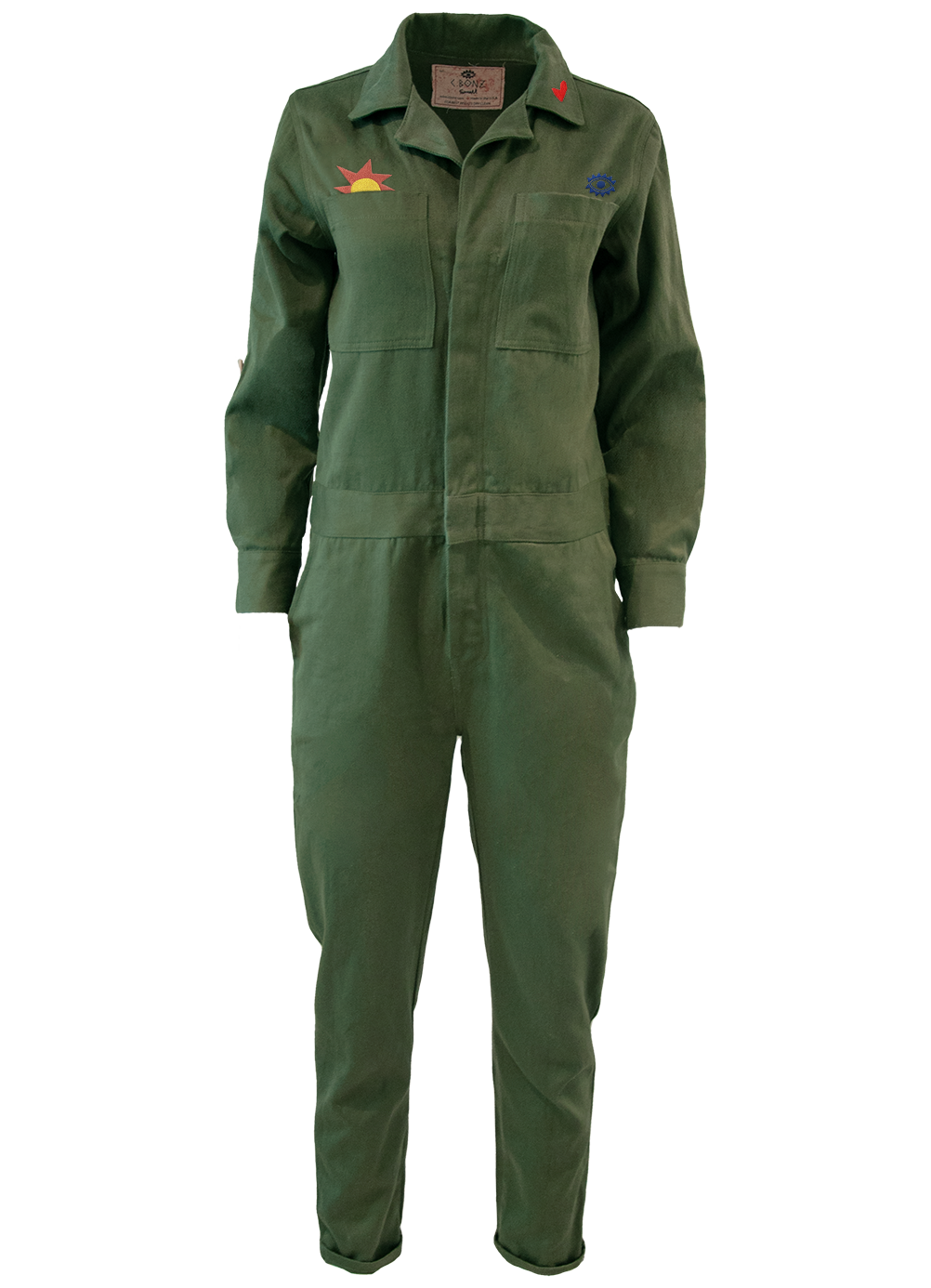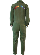 A sturdy yet soft jumpsuit with with a randomized rainbow button closure. Made in Los Angeles, California from organic hemp and cotton. Embellished with my signature "SOMEWHERE" art and happy face on the back. On the front is a sun peaking out of the pocket.