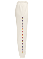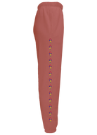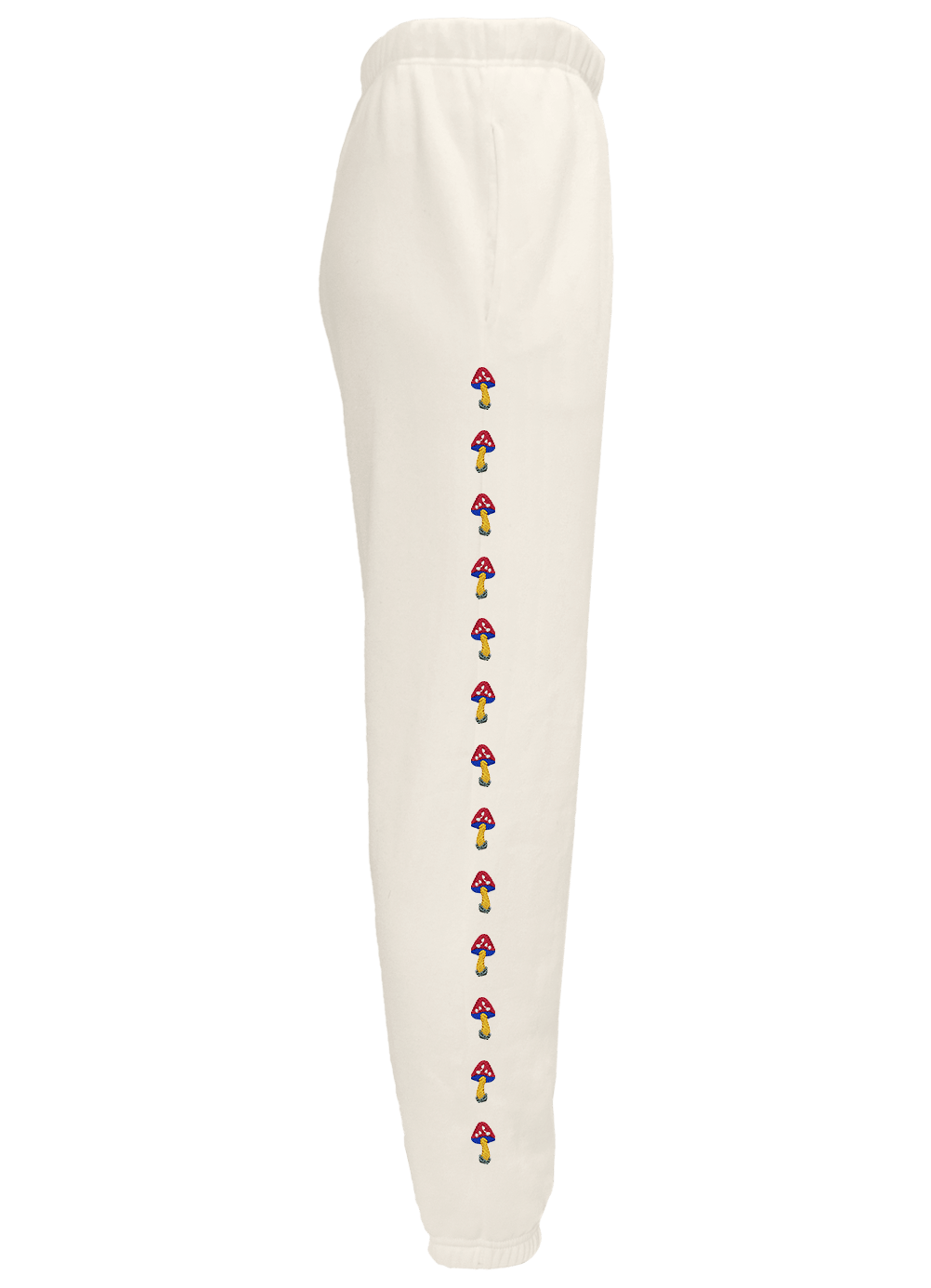 My classic sweatpants with front side-slip pockets made from my special Ridiculously Cozy fabric in your choice of cream, sunset pink, terracotta, or zuma blue. featuring mushrooms along the right leg.