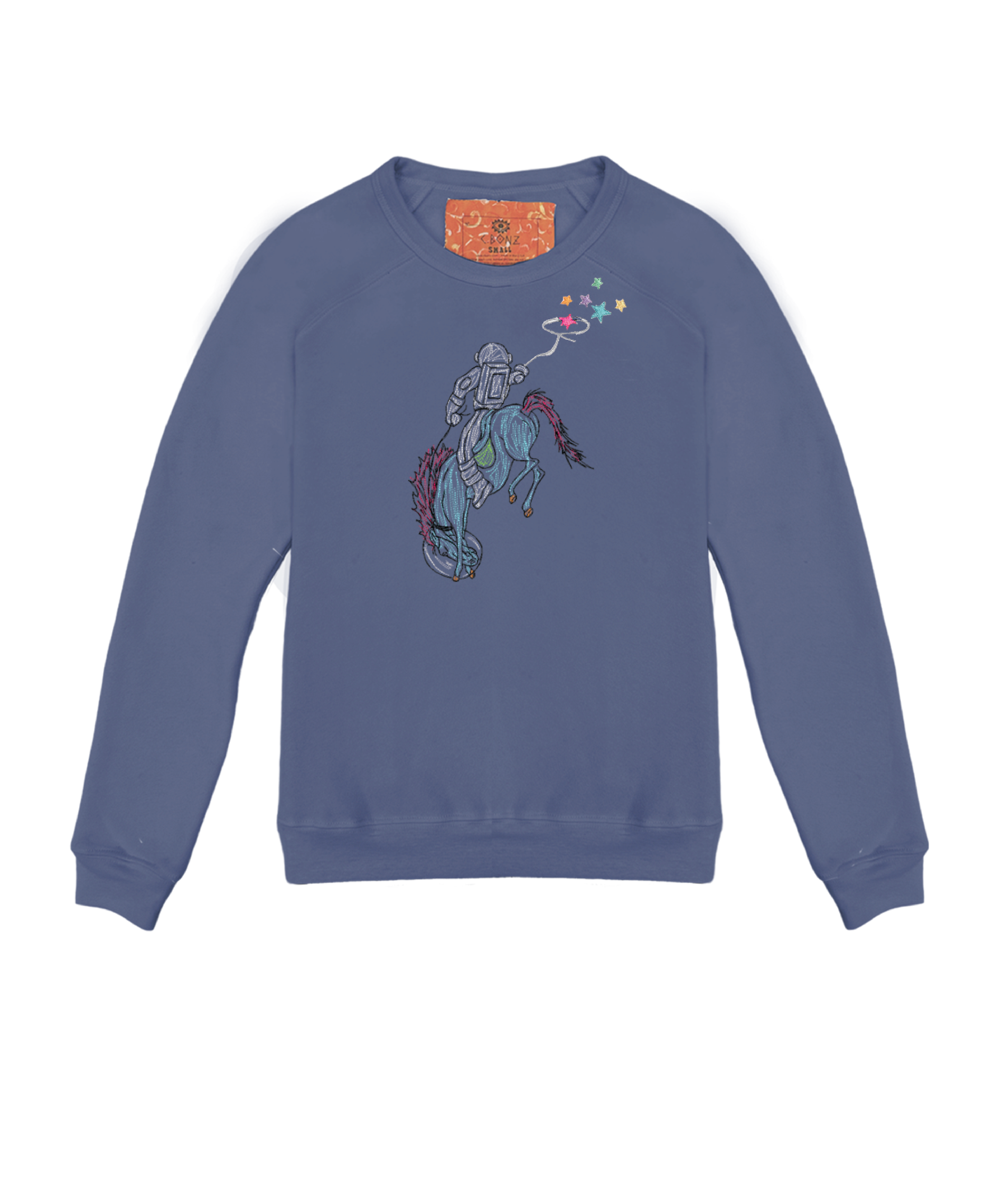 My classic cut crewneck pullover made from my special Ridiculously Cozy fabric in your choice of charcoal, cream, sunset pink, Zuma blue, or terracotta featuring my exclusive Space Cowboy embroidered on the center chest.