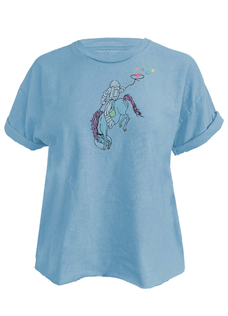 My women's Malibu Tee is perfectly sized between a crop top and a regular tee, offering a length that is just right- not too short and not too long. Made from breathable 100% cotton, it delivers a sporty relaxed fit showcasing my exclusive Space Cowboy design embroidered on the center chest