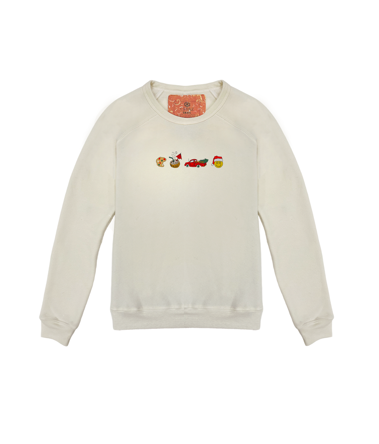 My classic women’s crewneck pullover made from my special Ridiculously Cozy fabric in our classic cream. Featuring my exclusive cookie, hot coco-nut, old truck & tree and happy santa embroidery on the center chest.