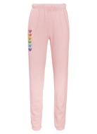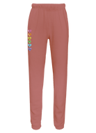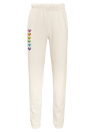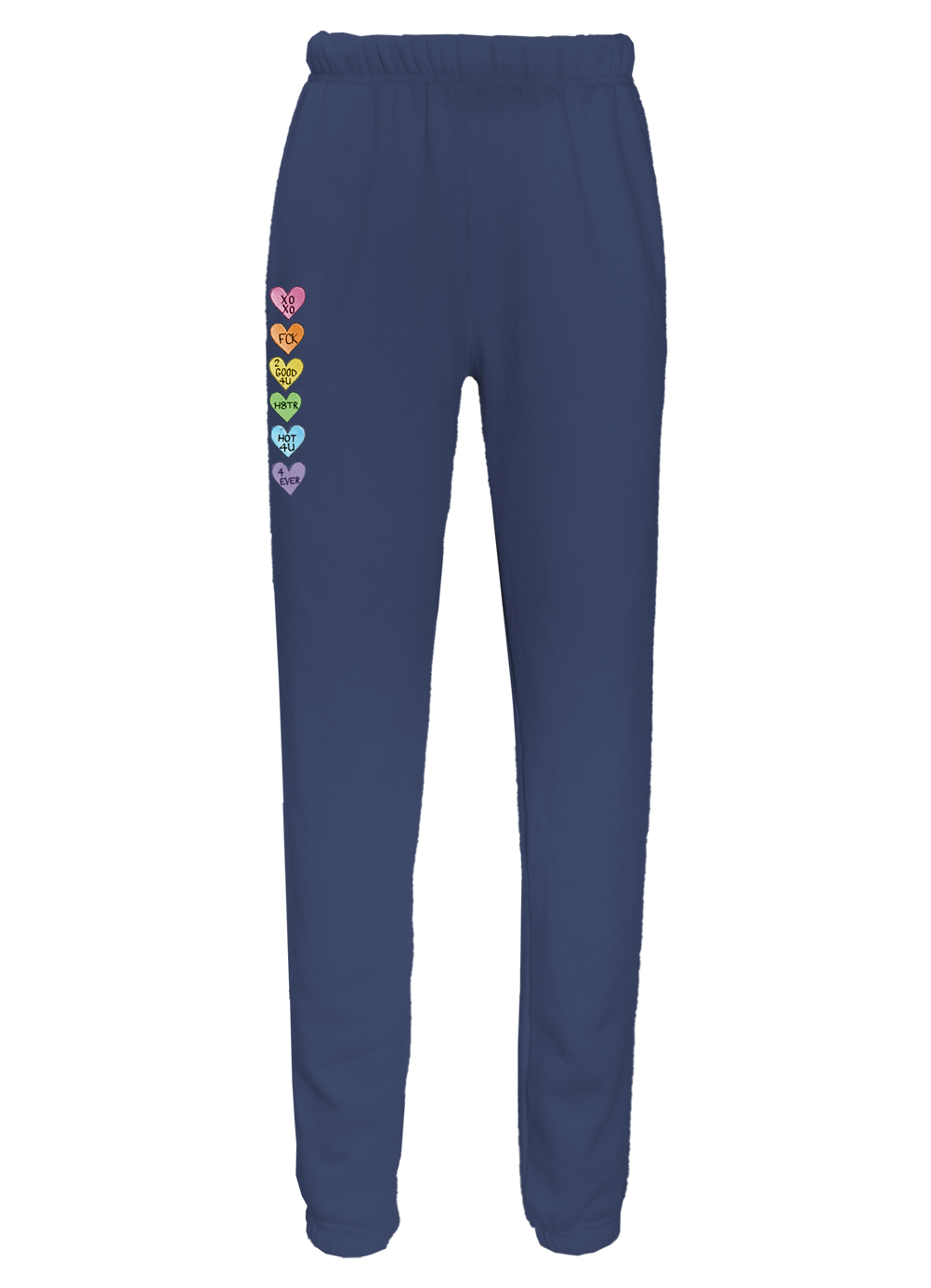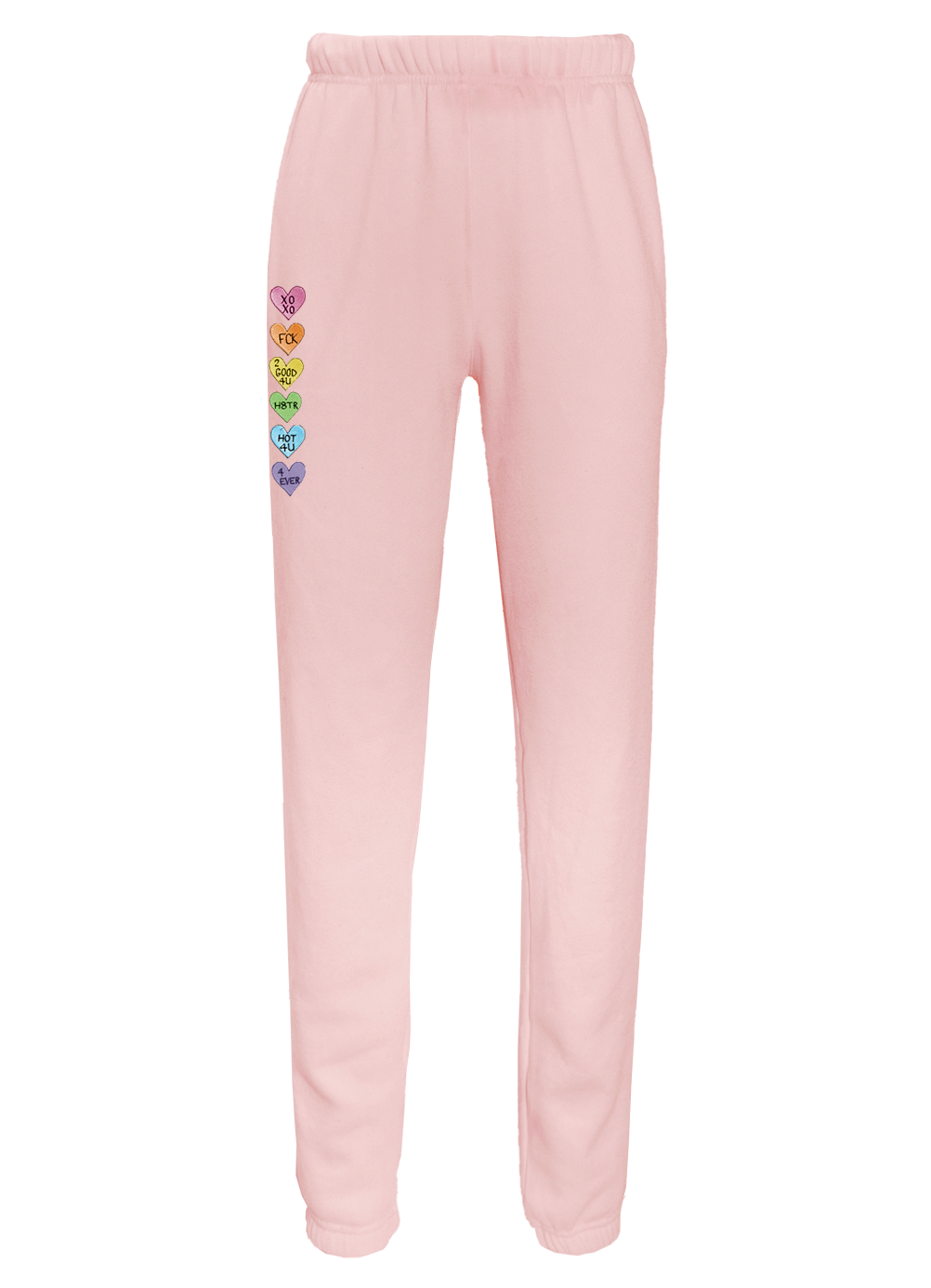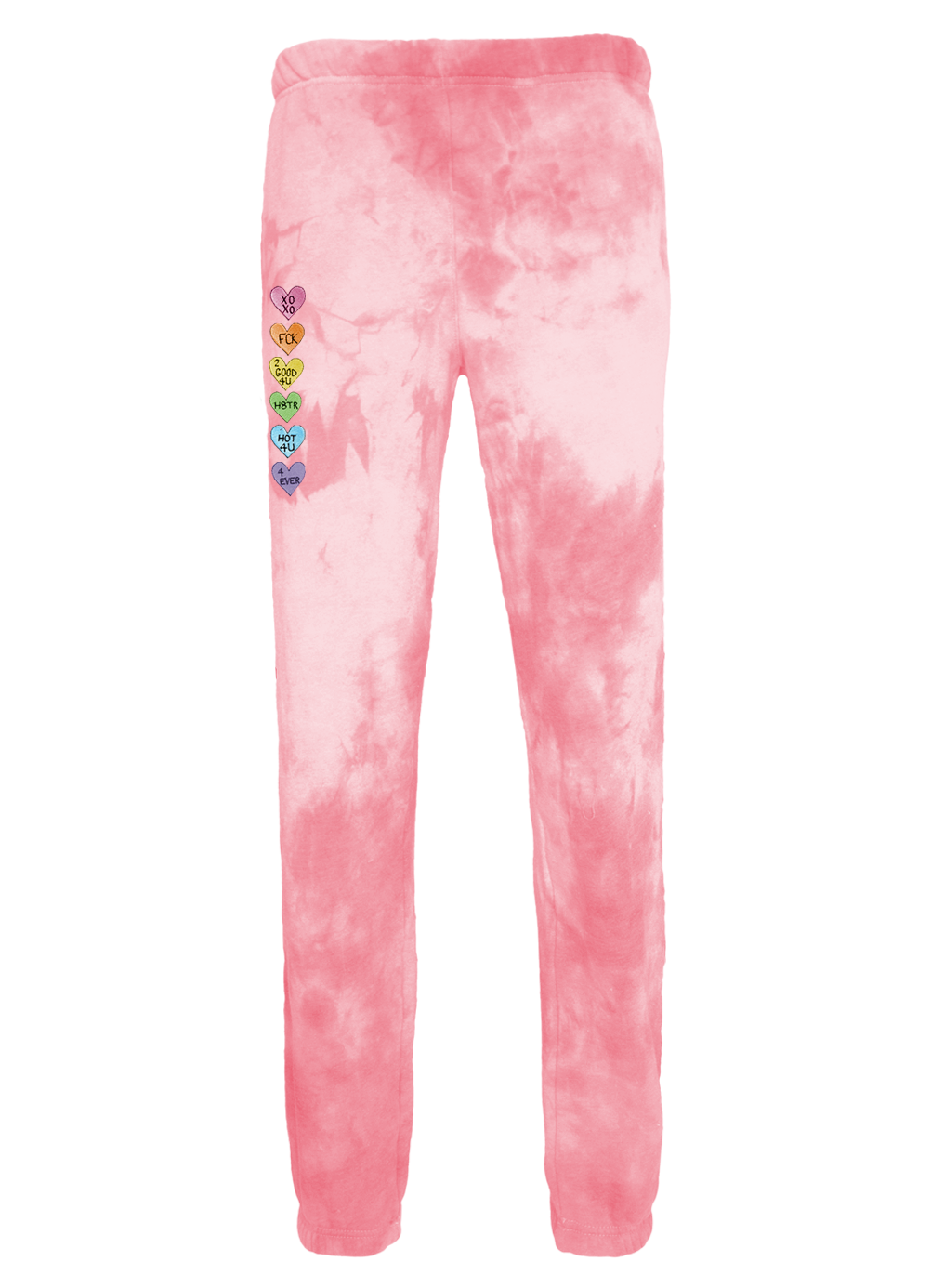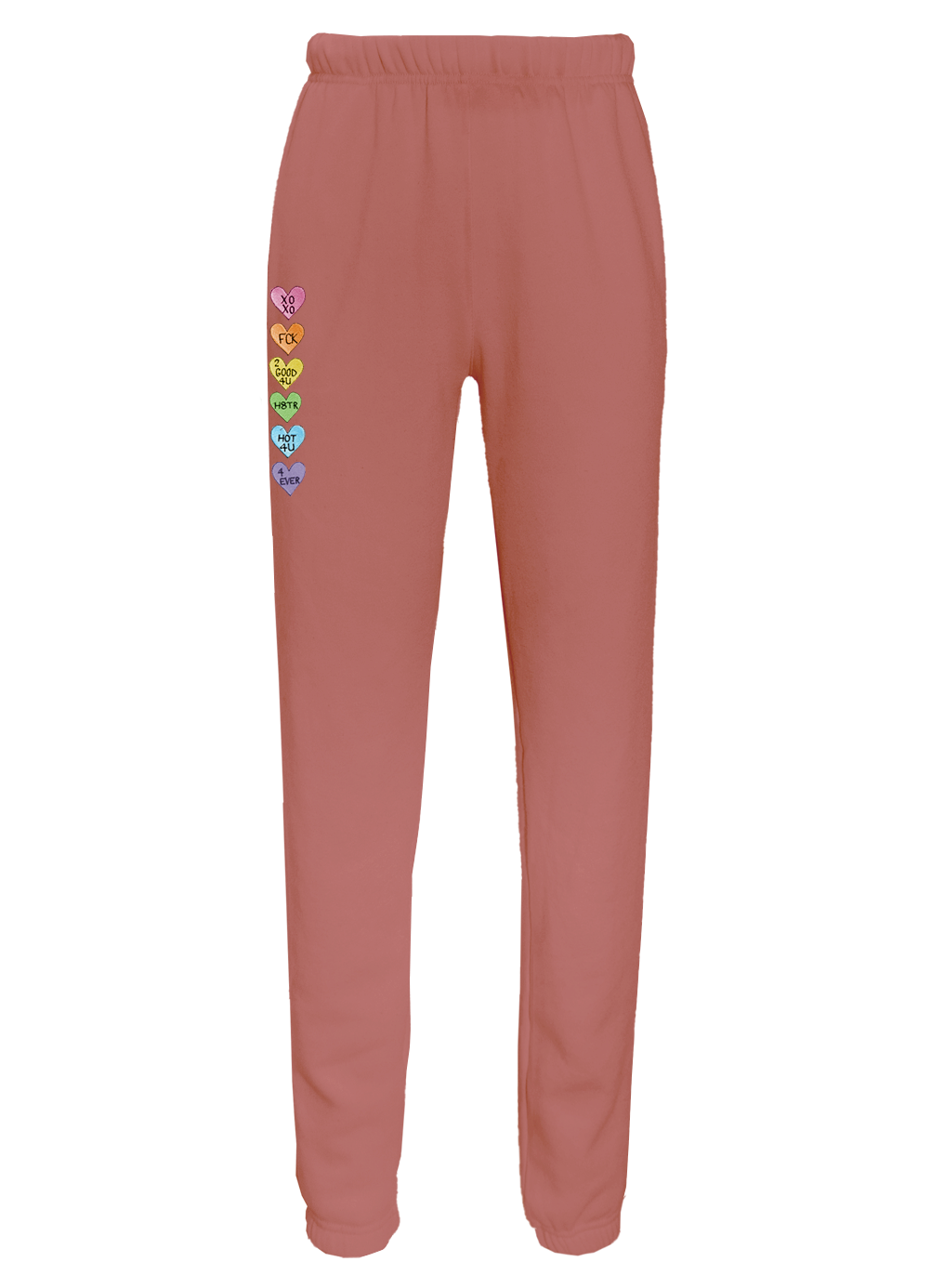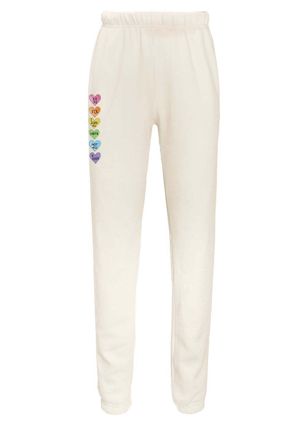 My classic sweatpants with front side-slip pockets in women’s sizing made from my special Ridiculously Cozy fabric in your choice of cream, sunset pink, terracotta, zuma blue, or pink tie dye featuring my exclusive Conversation Heart design embroidered down the right thigh. Made on demand in Malibu, California