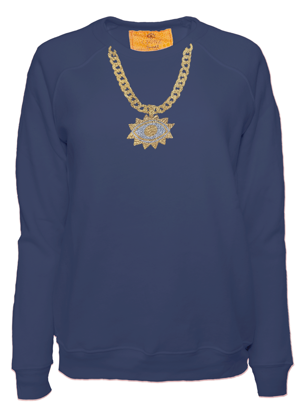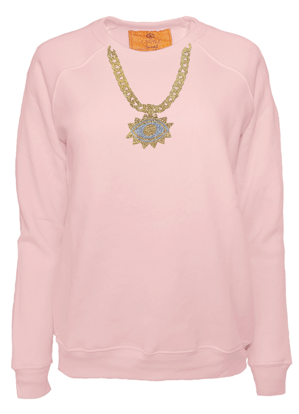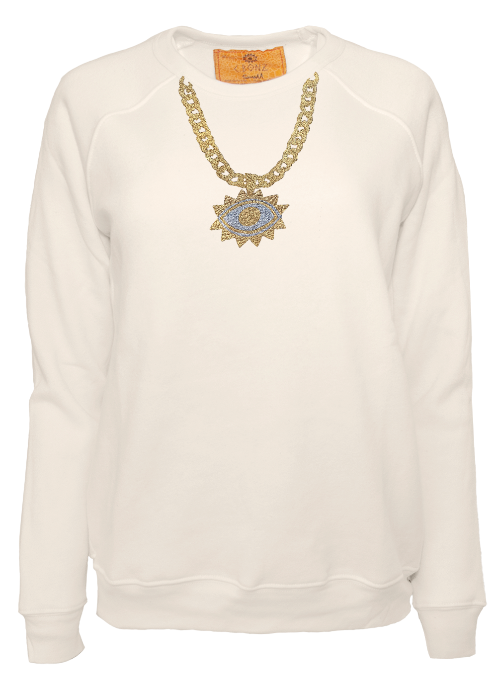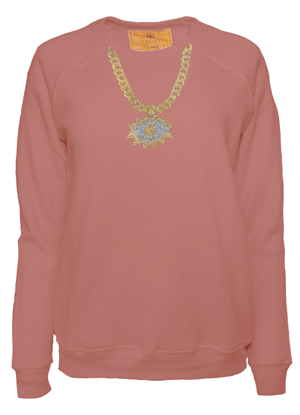 My classic cut crewneck pullover in women's sizing made from my special Ridiculously Cozy fabric in your choice of cream, zuma blue, sunset pink, or terracotta featuring my exclusive hand drawn large evil eye necklace embroidery in gold and silver thread.